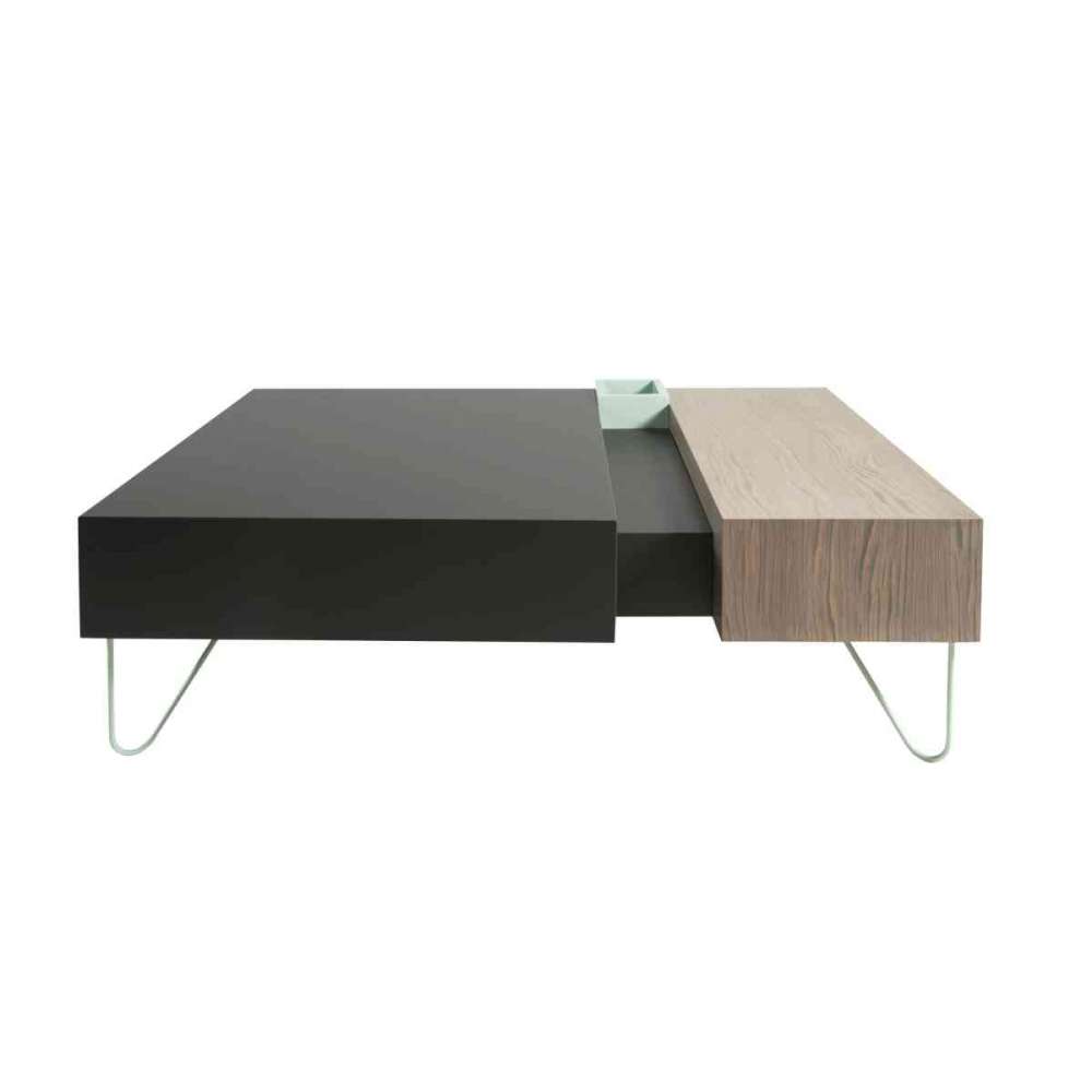 Niski stolik w dwóch wymiarach z 2 sekcjami blatu, pojemnikiem do przechowywania i metalową podstawą.