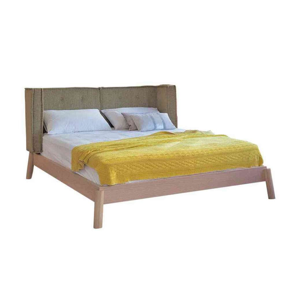 Łóżko z tapicerowanym zagłówkiem, drewnianą ramą i nogami.