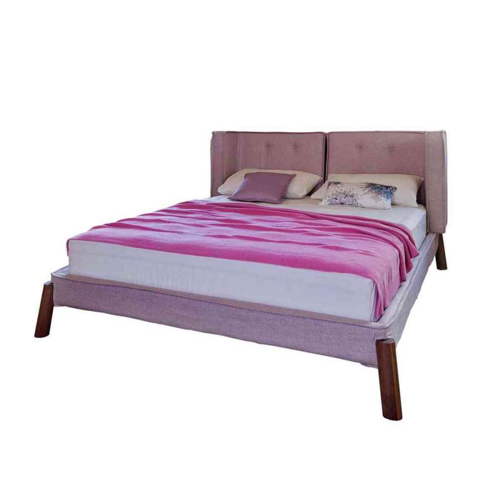 Łóżko z tapicerowanym wezgłowiem, tapicerowaną ramą i drewnianymi nogami.