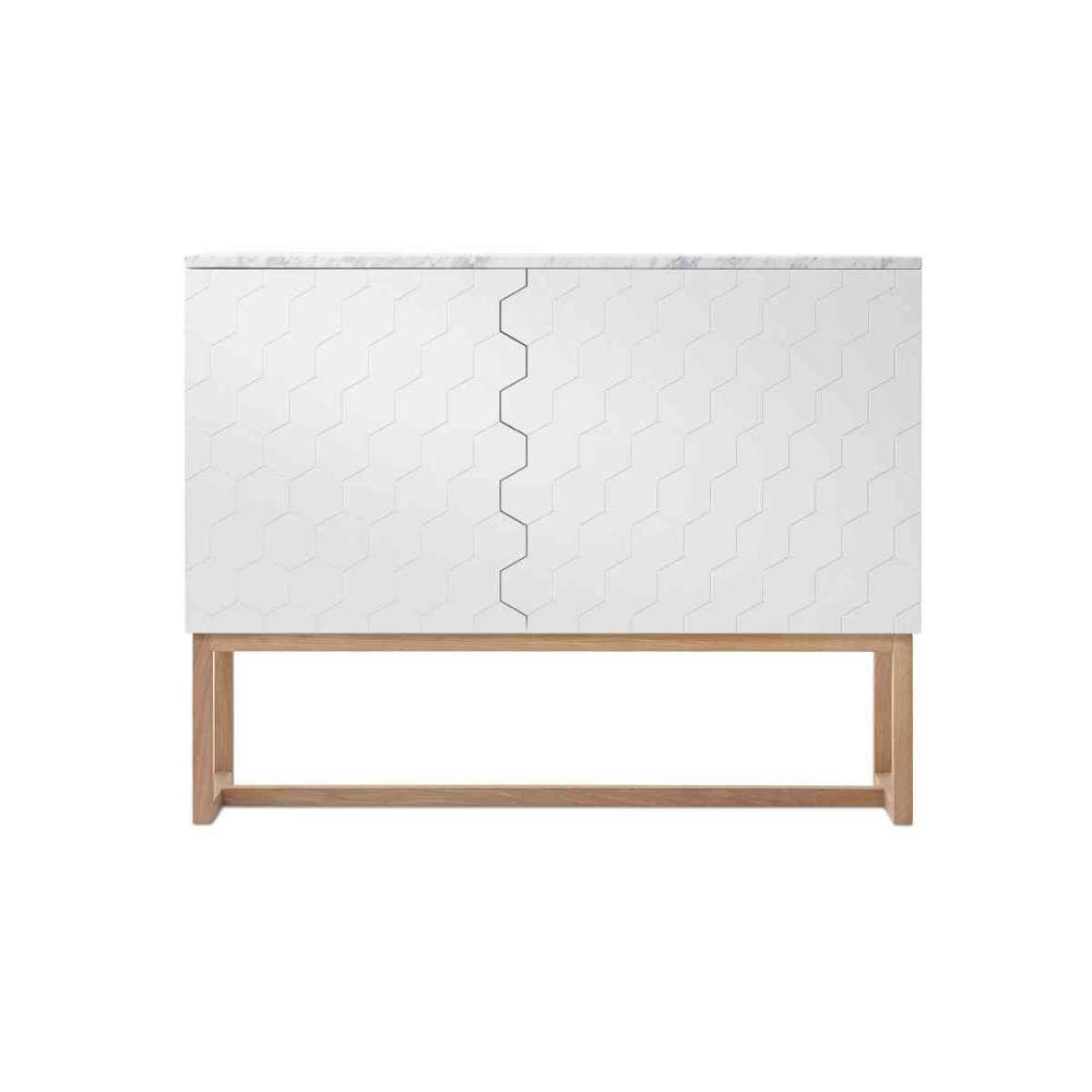 Szafka Honey ma swoją nazwę i wzór frontów inspirowany plastrami miodu stworzonymi przez naturę. Wyraz jest graficzny z ciekawym otworem.