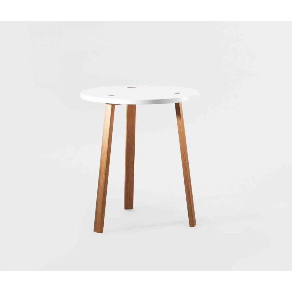 Rodzina Happy składa się ze sztaplowanych stołków i krzeseł, stołków barowych i stołów. Projekt jest zabawny, a wyraziste kolory elegancko łączą się z prawdziwym dębem. Dwa mniejsze stoły mają trzy nogi, a duży ma cztery nogi.