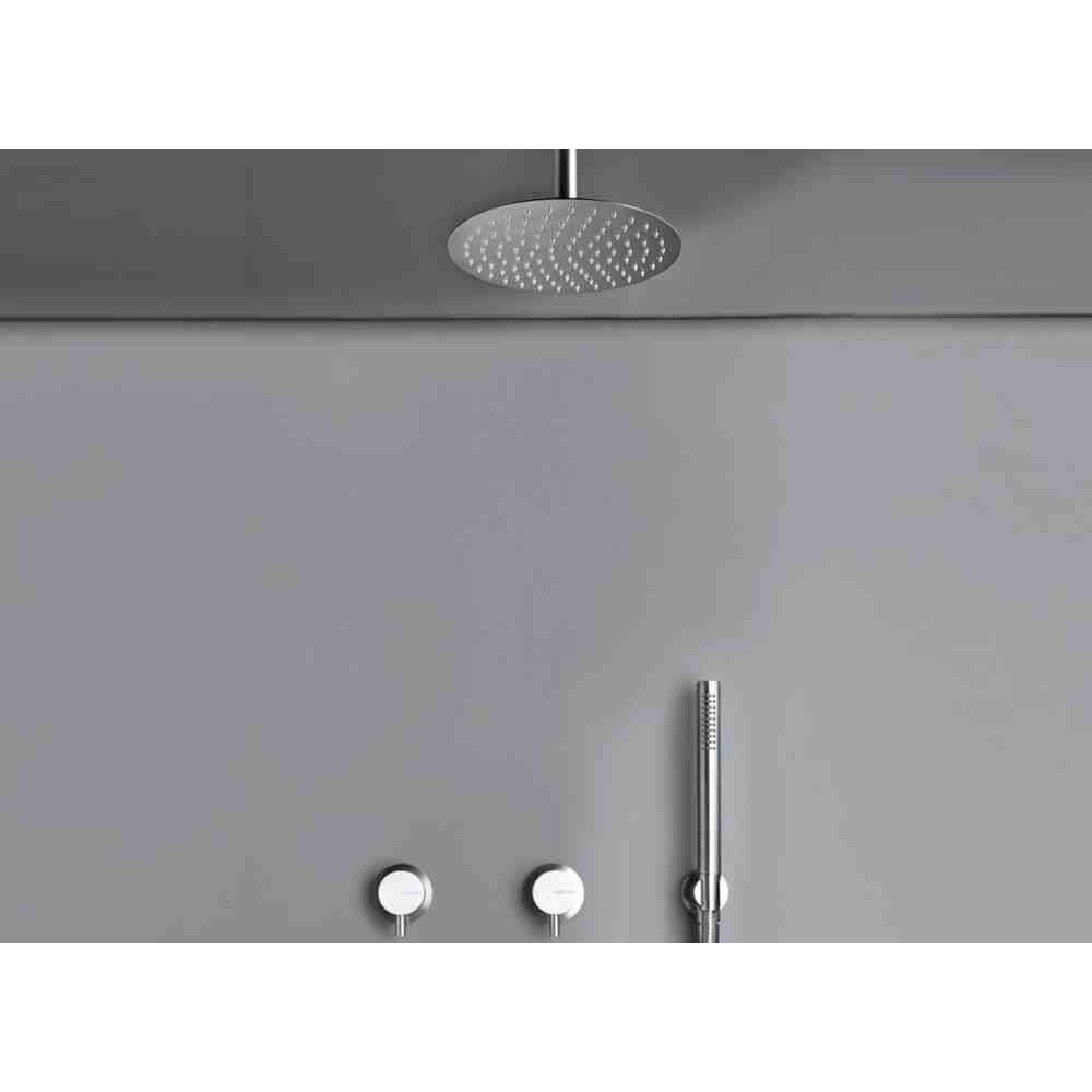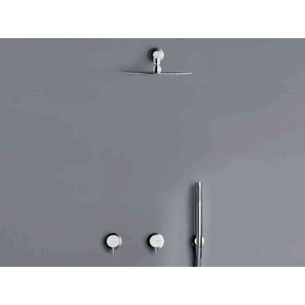 Ten zestaw prysznicowy zawiera: dwie baterie naścienne, słuchawkę prysznicową z plecionym wężem ze stali nierdzewnej i uchwytem na słuchawkę oraz 250 mm. deszczownica z mocowaniem do ściany lub sufitu.