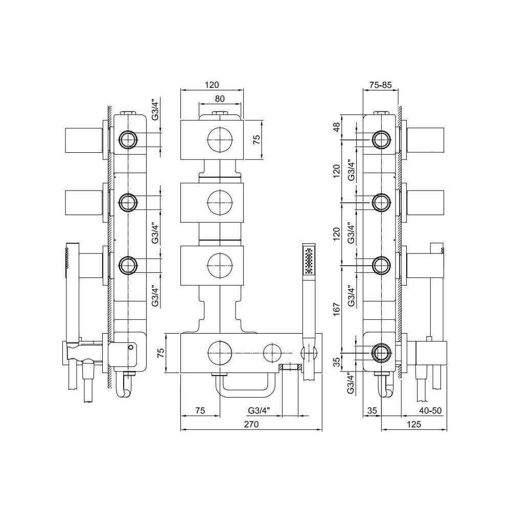 Termostatyczna bateria wannowo-prysznicowa do zabudowy (3/4”) z 4 wyjściami, korkiem, prysznicem ręcznym FIT, elastycznym PVC i uchwytem.