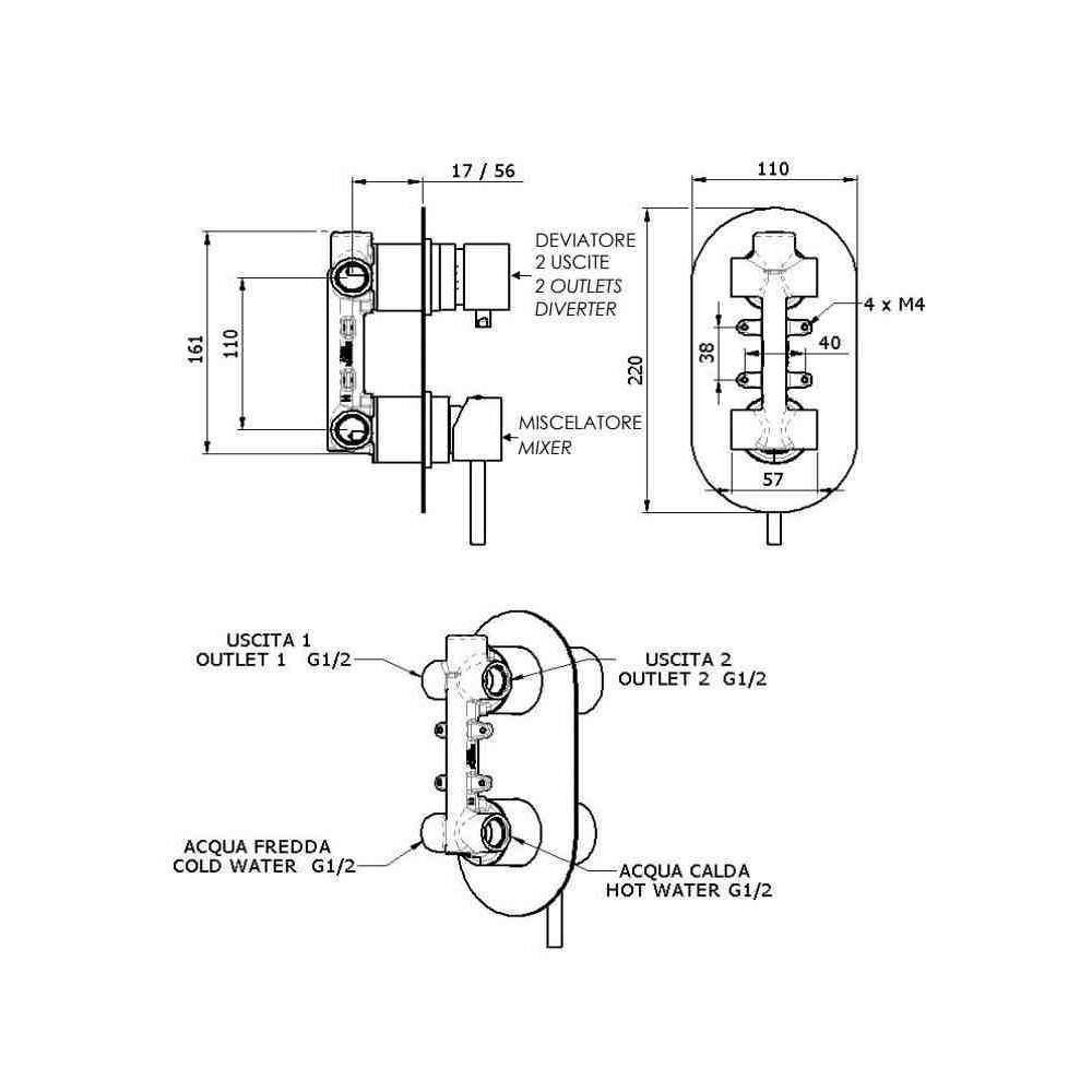 Bateria prysznicowa mosiężna jednouchwytowa wpuszczana z przełącznikiem Rubinetterie Mariani Ultraminimal