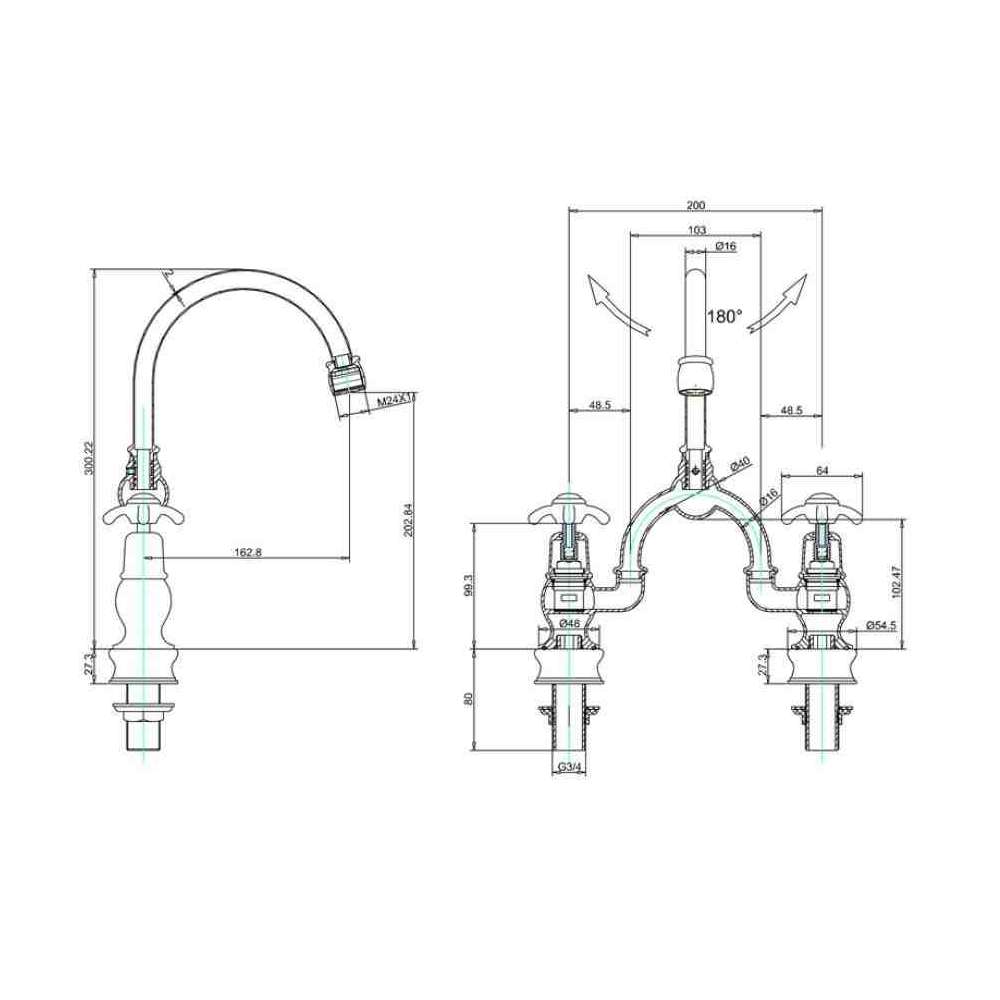 Anglesey to dwuotworowa bateria umywalkowa bez odpływu. Jest wyposażony w regulator przepływu do użytku przy niskim ciśnieniu wody, z aeratorem do użytku przy wysokim ciśnieniu wody. Możliwość obrotu w wersji o ćwierć obrotu lub przykręcanej.