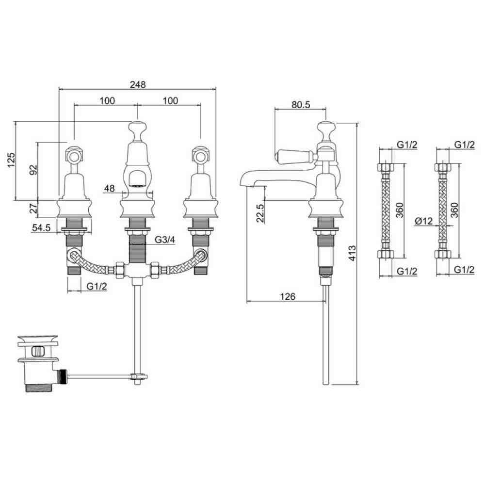 Bateria umywalkowa nablatowa 3-otworowa z odpływem pop-up Burlington Bathrooms KENSINGTON REGENT