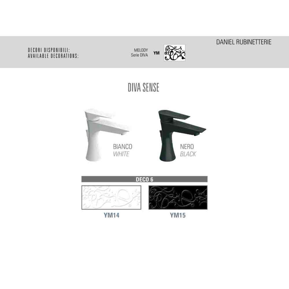 DIVA to lekka i delikatna linia, odzwierciedlająca wyrafinowaną kulturę życia. Zrodzony z pragnienia maksymalnej proporcji, jest symbolem eleganckiej nowoczesności. Projekt podąża za ideą prostej linii, która łagodnie wygina się, podkreśla i bawi się jej kobiecością. Połączenie konturów ciała i wieloaspektowych ust tworzy oprawę eterycznej perfekcji. Kolekcja DIVA DEKORA SENSE proponuje reliefowe wykończenie połączone z dekorem MELODY: słodki i przyjemny motyw, który podkreśla i intensyfikuje harmonijną linię baterii. Zastosowanie minimalnego wkładu o średnicy 25, również produkowanego w naszych fabrykach we Włoszech, nadaje Divie silną dominację cienkości i nacisku.