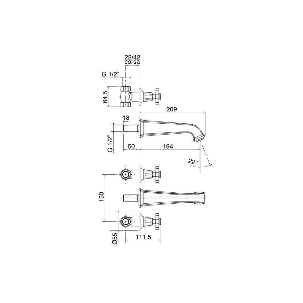 Bateria umywalkowa ścienna 3-otworowa Gentry Home Chopin Metal