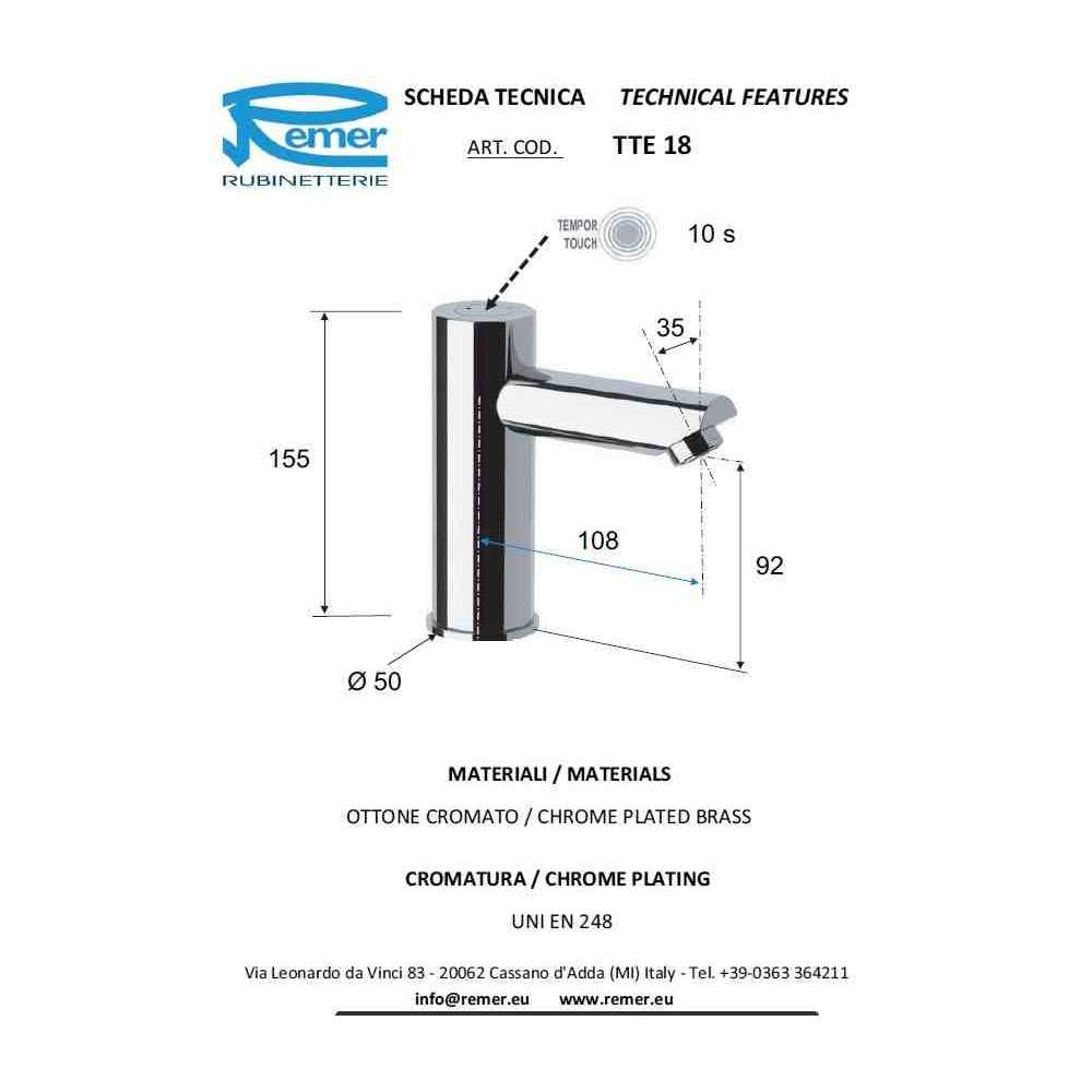 Baterie umywalkowe Remer Rubinetterie, Tempor Touch, Baterie umywalkowe, Baterie łazienkowe, Baterie umywalkowe, Baterie umywalkowe w stylu współczesnym, Baterie umywalkowe Metal, Baterie umywalkowe Mosiądz, Baterie umywalkowe Chromowany mosiądz, Baterie umywalkowe 1-otworowe, Baterie umywalkowe Samozamykające, Baterie umywalkowe, Baterie umywalkowe z polerowanym wykończeniem, PIEZO