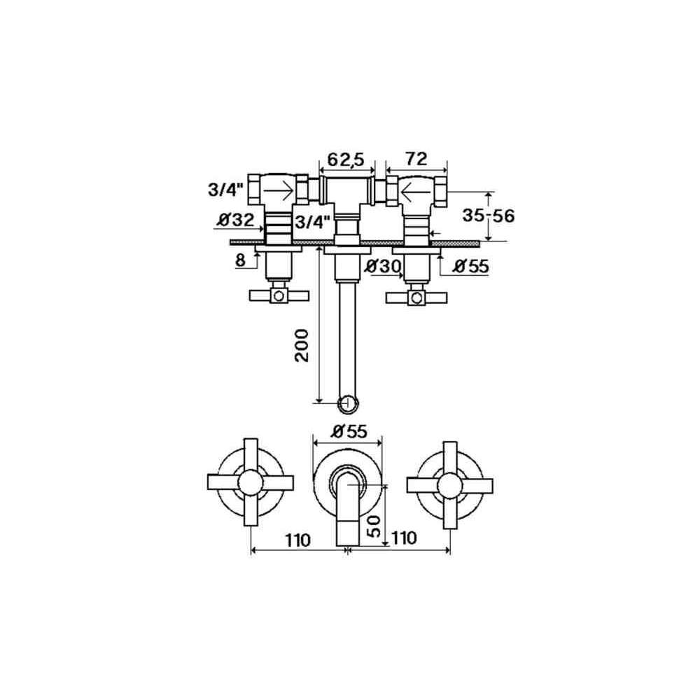 Bateria umywalkowa ścienna 3-otworowa RVB Sully