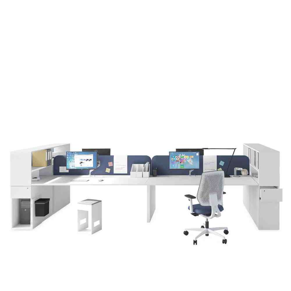 Joint to system regałów - o szerokości 33 cm, głębokości 80/163 cm i wysokości 126 cm - opracowany do integracji z biurkami Asterisco App. Ta kombinacja tworzy stanowiska pracy ze zintegrowanym schowkiem, zamknięte od dołu i otwarte w górnej części: funkcjonalne stanowisko pracy o wysokim poziomie prywatności.