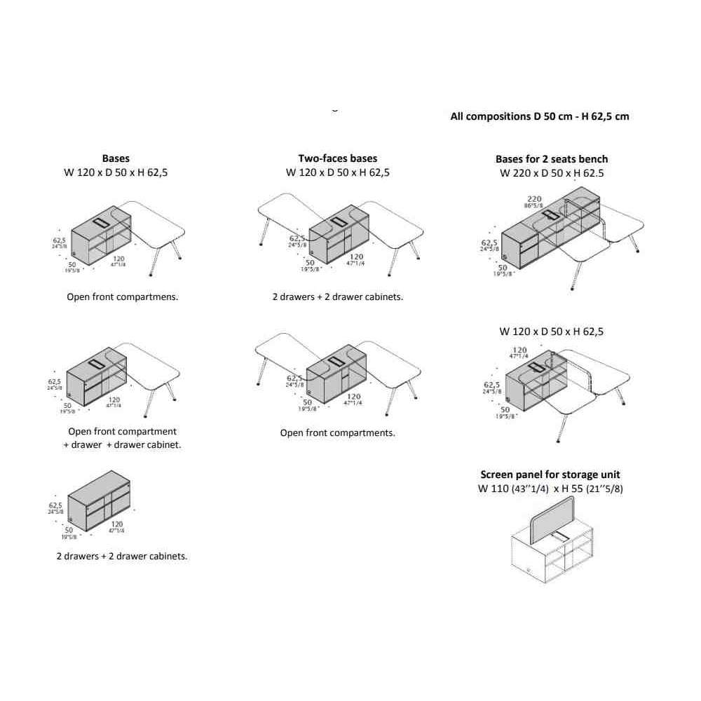 Różne jednostki przechowywania są zintegrowane z procesorem, drzwiami uchylnymi lub przesuwnymi, otwartymi przedziałami, dostępem od góry i przedziałami technicznymi do przechowywania kabli i gniazdek elektrycznych.