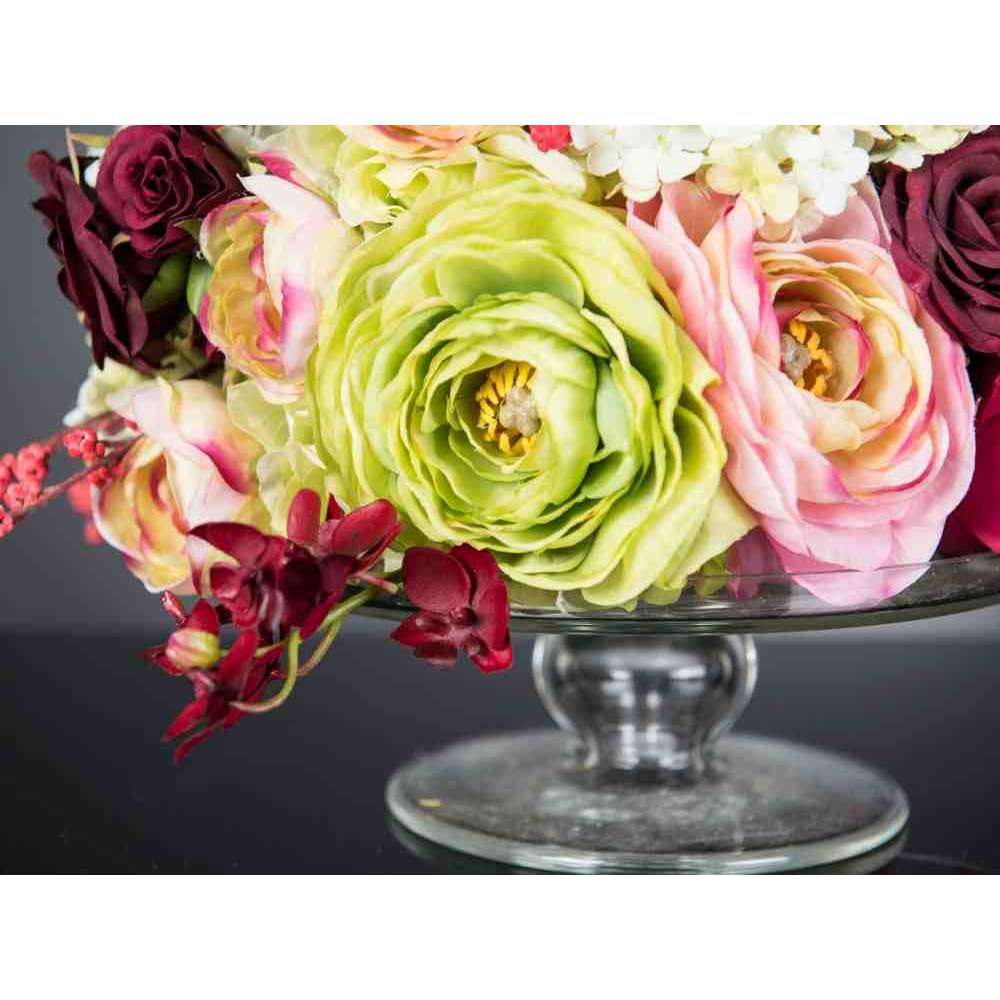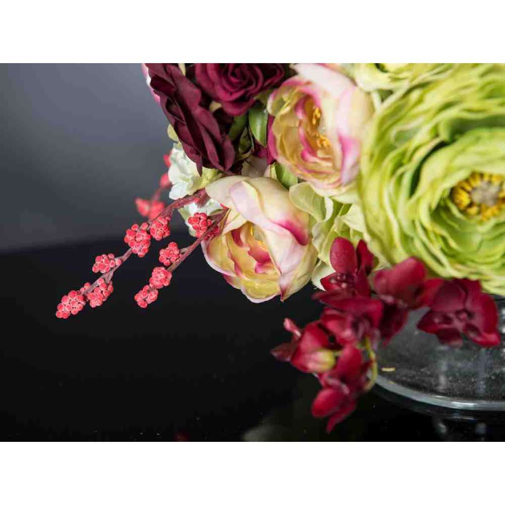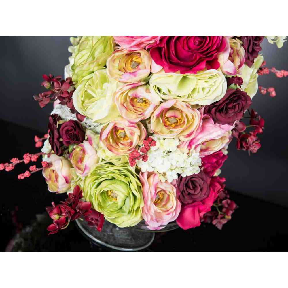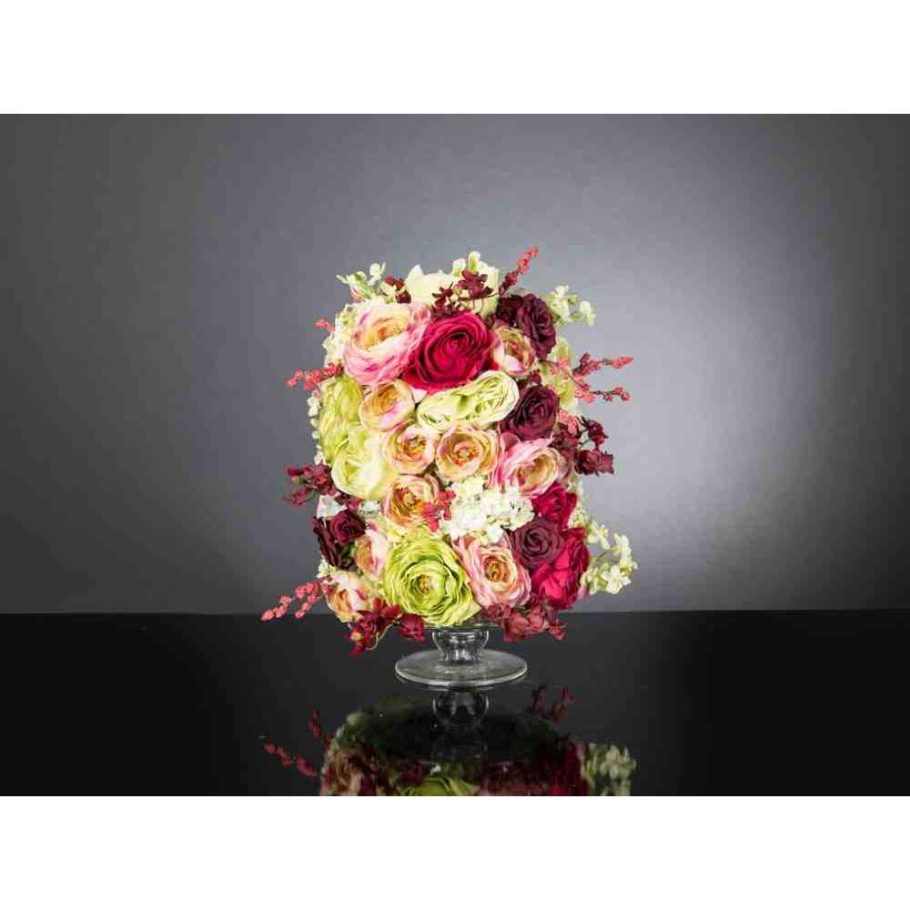 KYOTO to sztuczna kompozycja kwiatowa w przezroczystym szklanym stojaku z różnymi sztucznymi kwiatami i „wodną iluzją”, stworzoną przez naszych florystów. Idealny do wystroju wnętrz lub oprawy wesel i imprez.