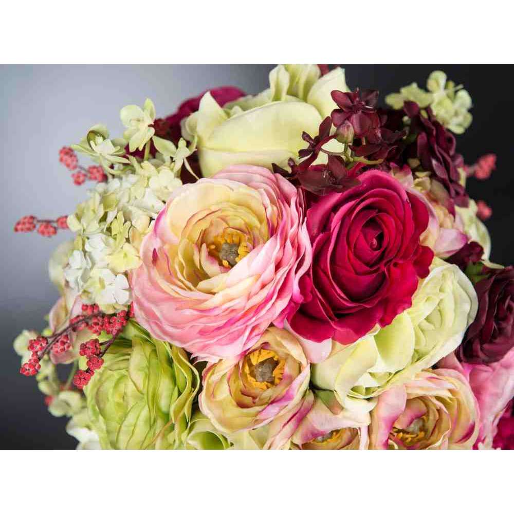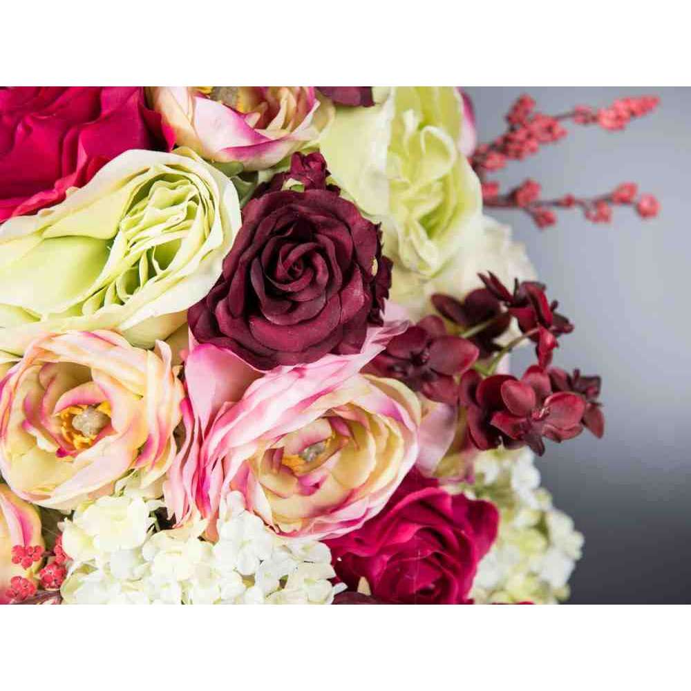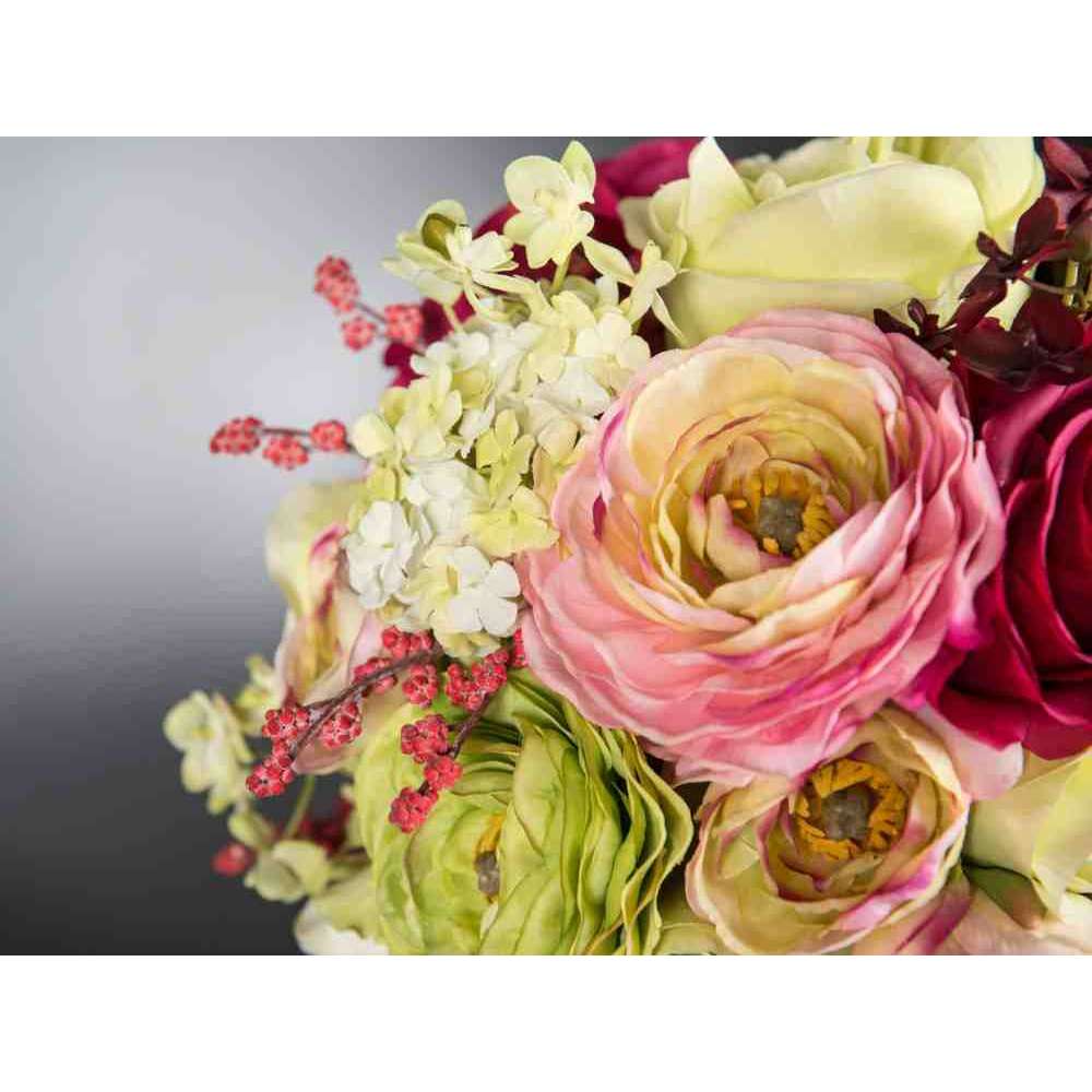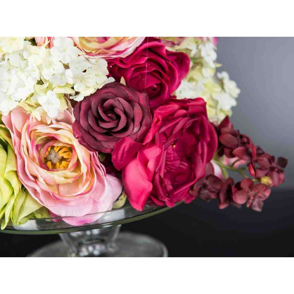 KYOTO to sztuczna kompozycja kwiatowa w przezroczystym szklanym stojaku z różnymi sztucznymi kwiatami i „wodną iluzją”, stworzoną przez naszych florystów. Idealny do wystroju wnętrz lub oprawy wesel i imprez.