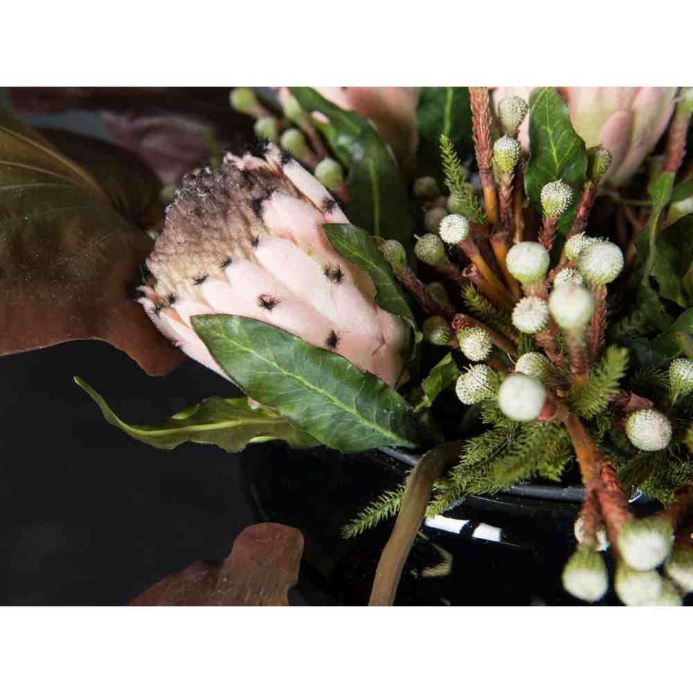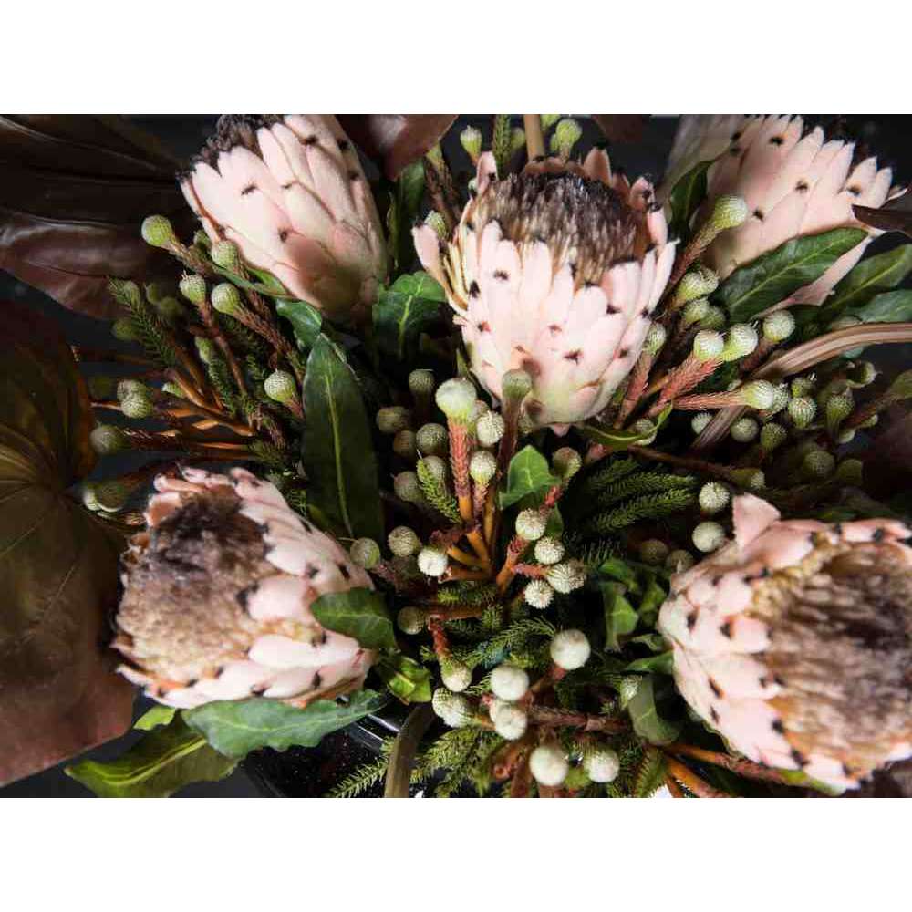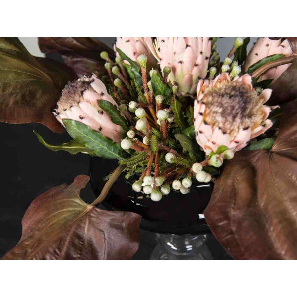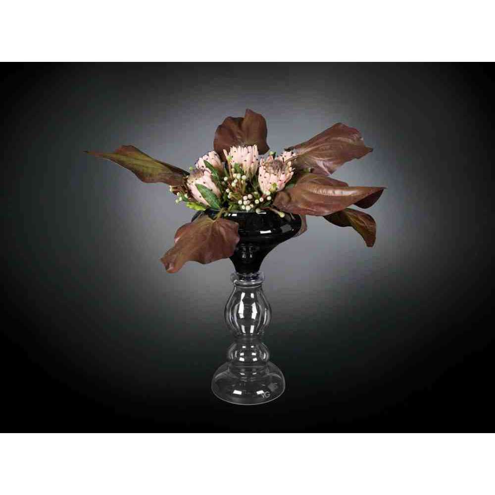MYKONOS to sztuczna kompozycja kwiatowa w szklanym wazonie ze sztuczną rośliną i „wodną iluzją”, stworzona przez naszych florystów. Idealny do wystroju wnętrz lub oprawy wesel i imprez.