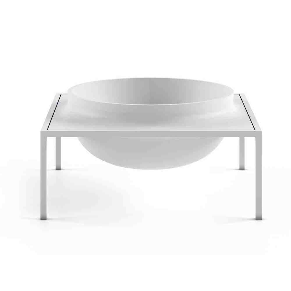 Istotną cechą tego projektu jest blat, który wydaje się topić i spływać, tworząc pojemnik, jakby nieświadomy minimalnej konstrukcji stalowej, na której się opiera.