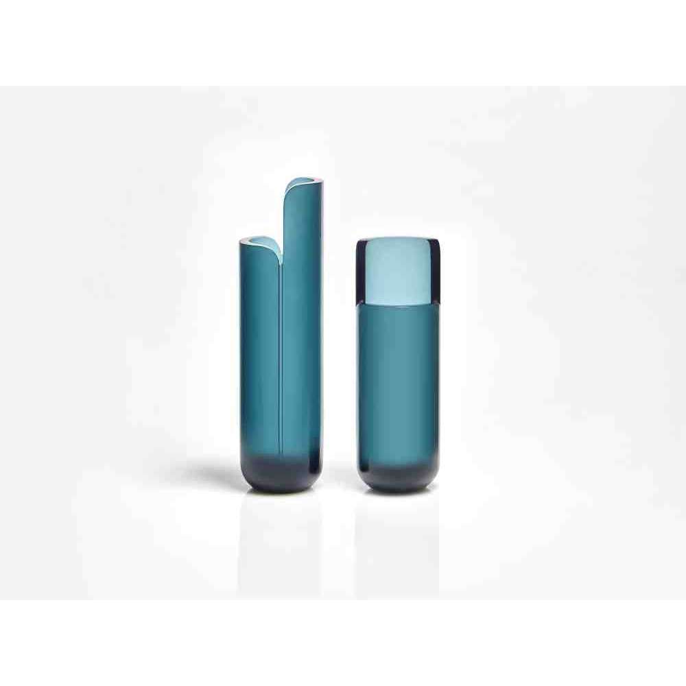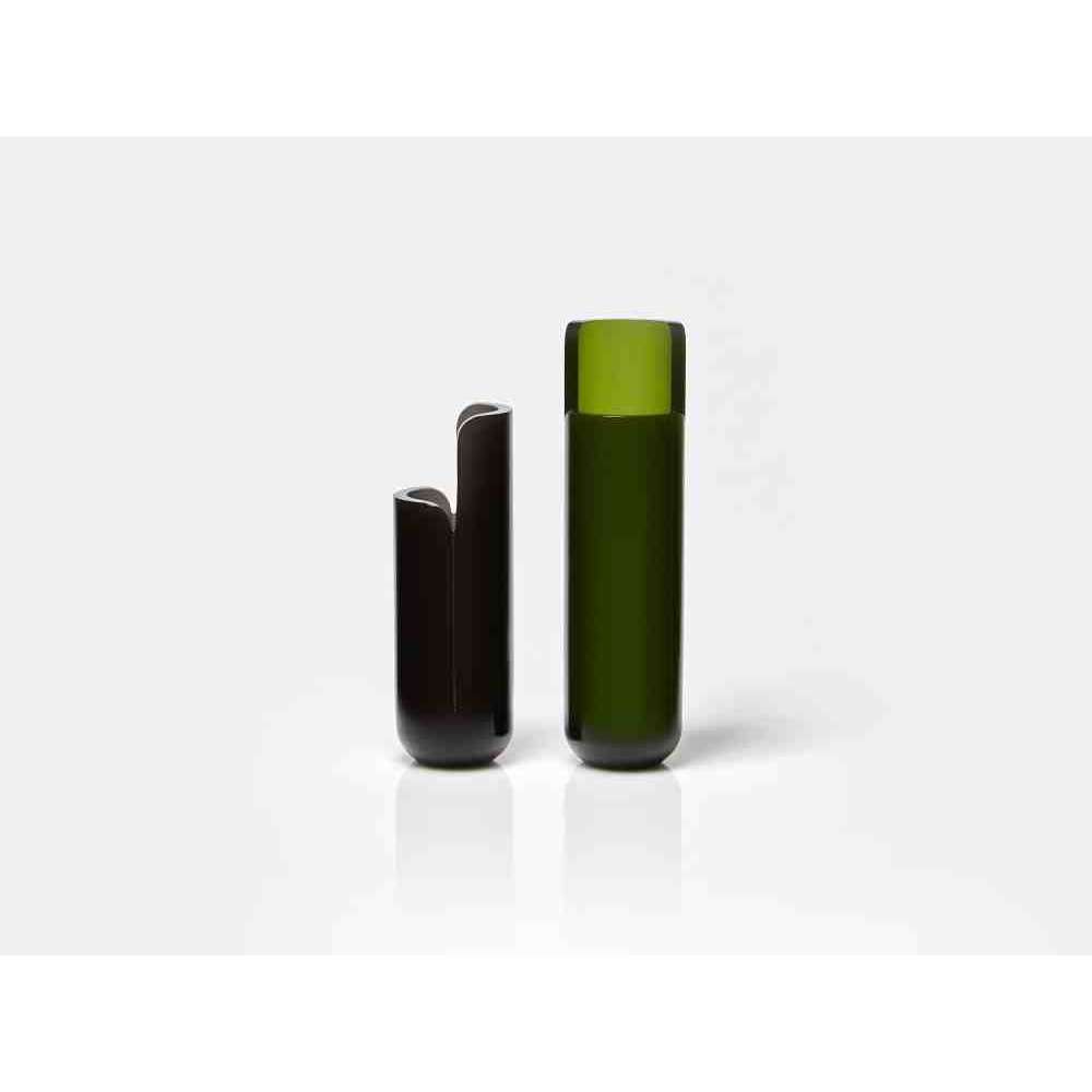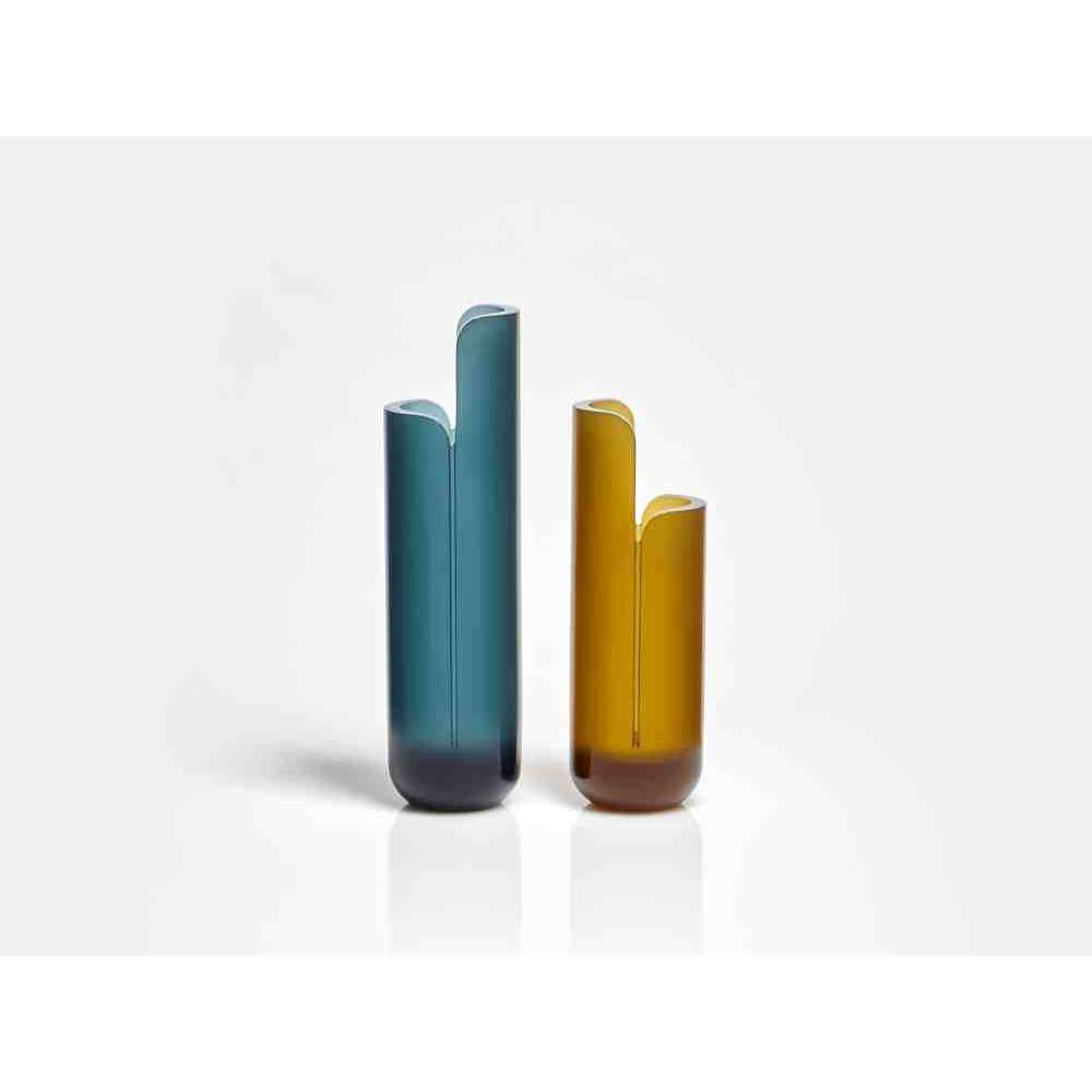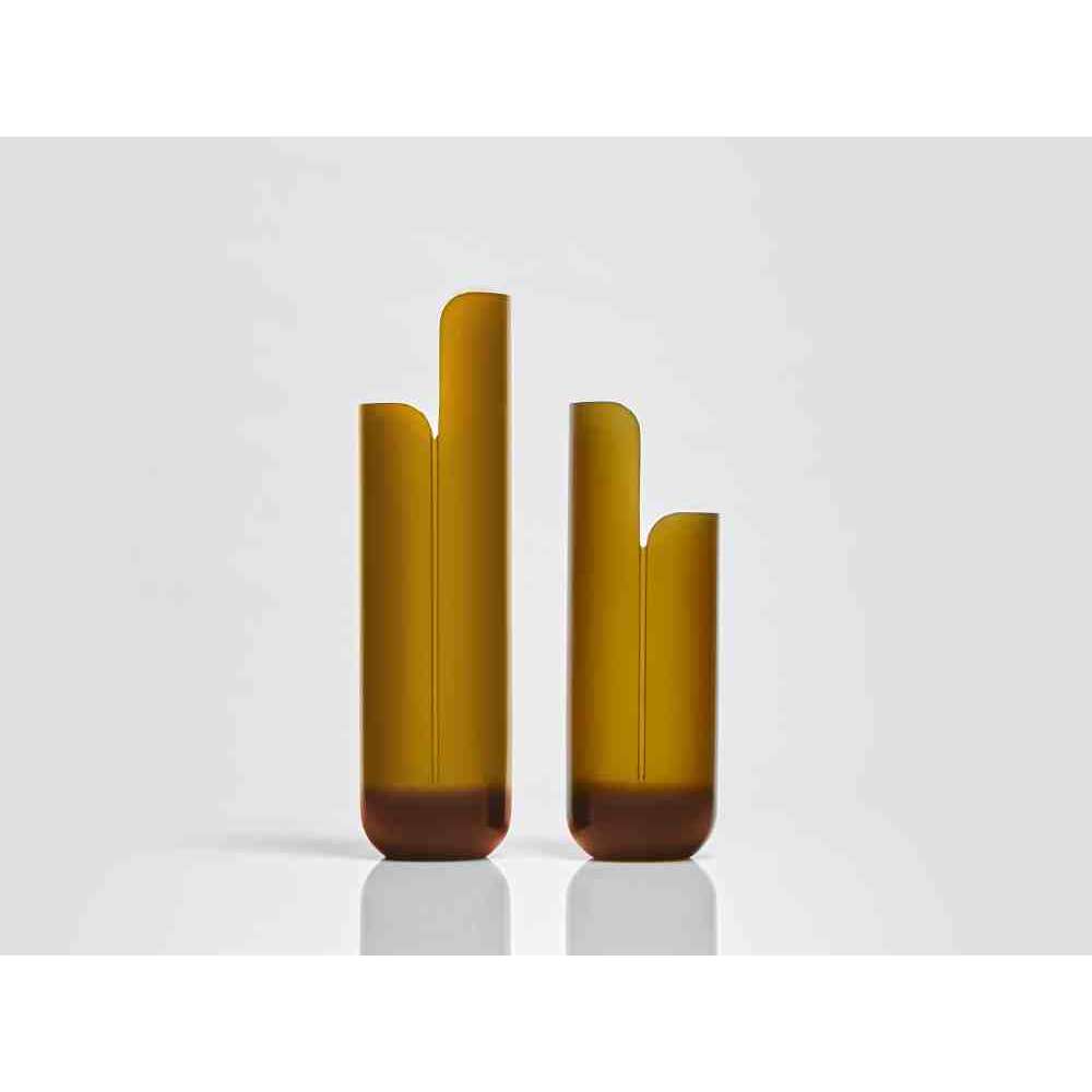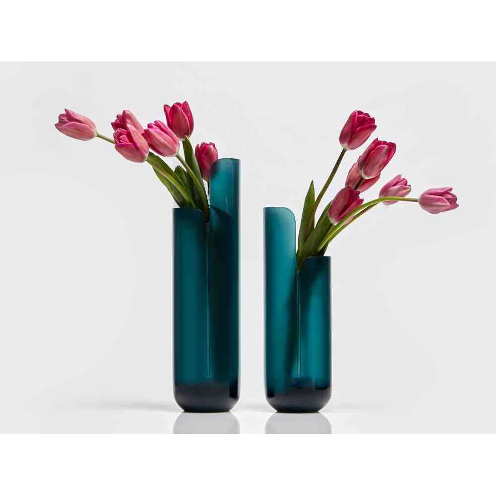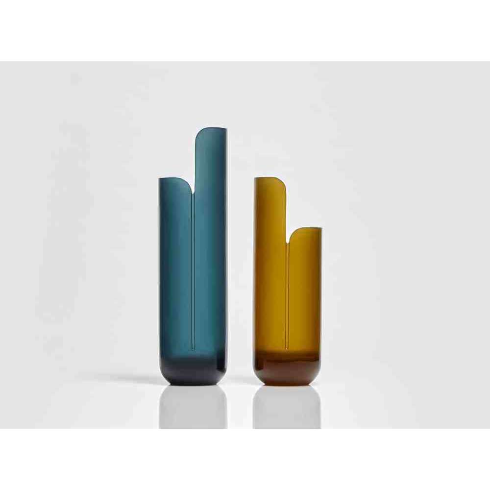 o różnych wysokościach i średnicach zwęża się u góry tak, aby zdefiniować krawędź, górną koronę, która rozjaśnia obraz i zachęca oko do zbieżności w kierunku zawartości wazonu. W serii NISI integruje się z kształtem stożka bez przerwy, aby otworzyć i pomieścić wspaniały bukiet kwiatów. Wreszcie w serii MASA głębokie cięcie, wyraźny znak oddziela, ale jednocześnie łączy dwie połowy objętości, która rozwija się na wysokość, osiągając różne wysokości, nadając wazonowi niezwykły wygląd.