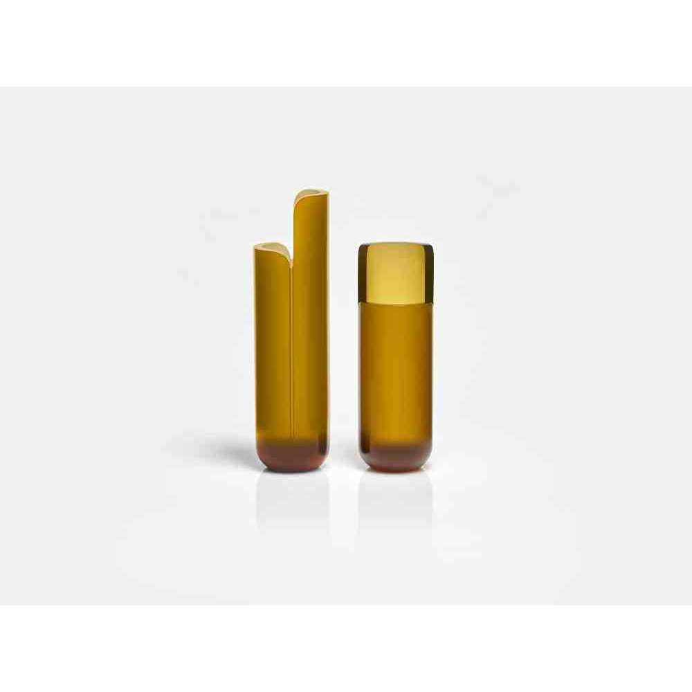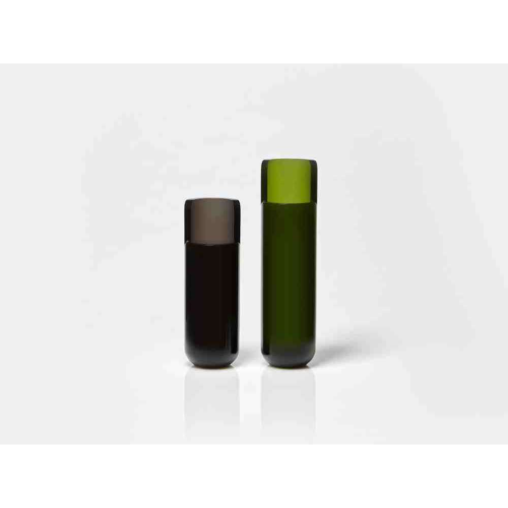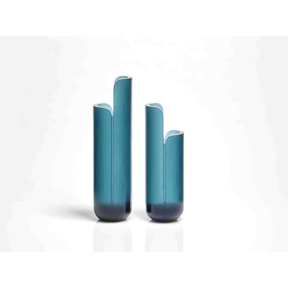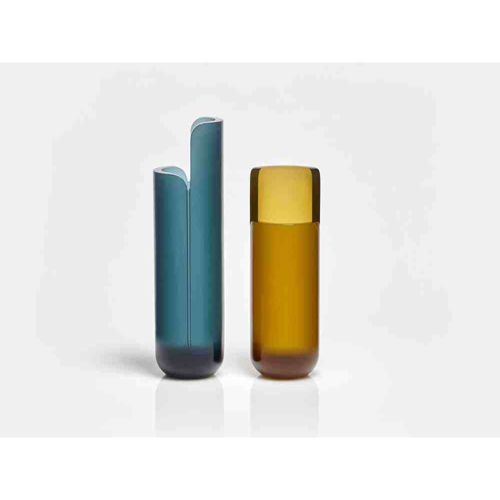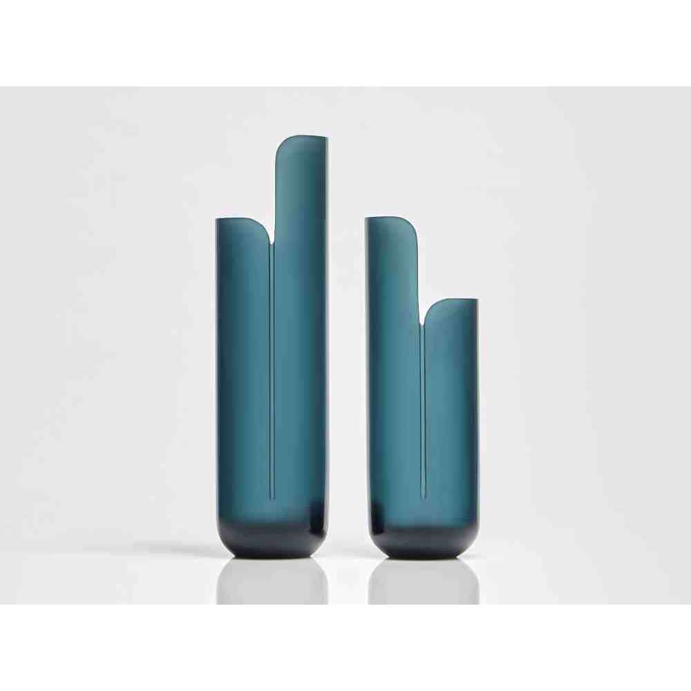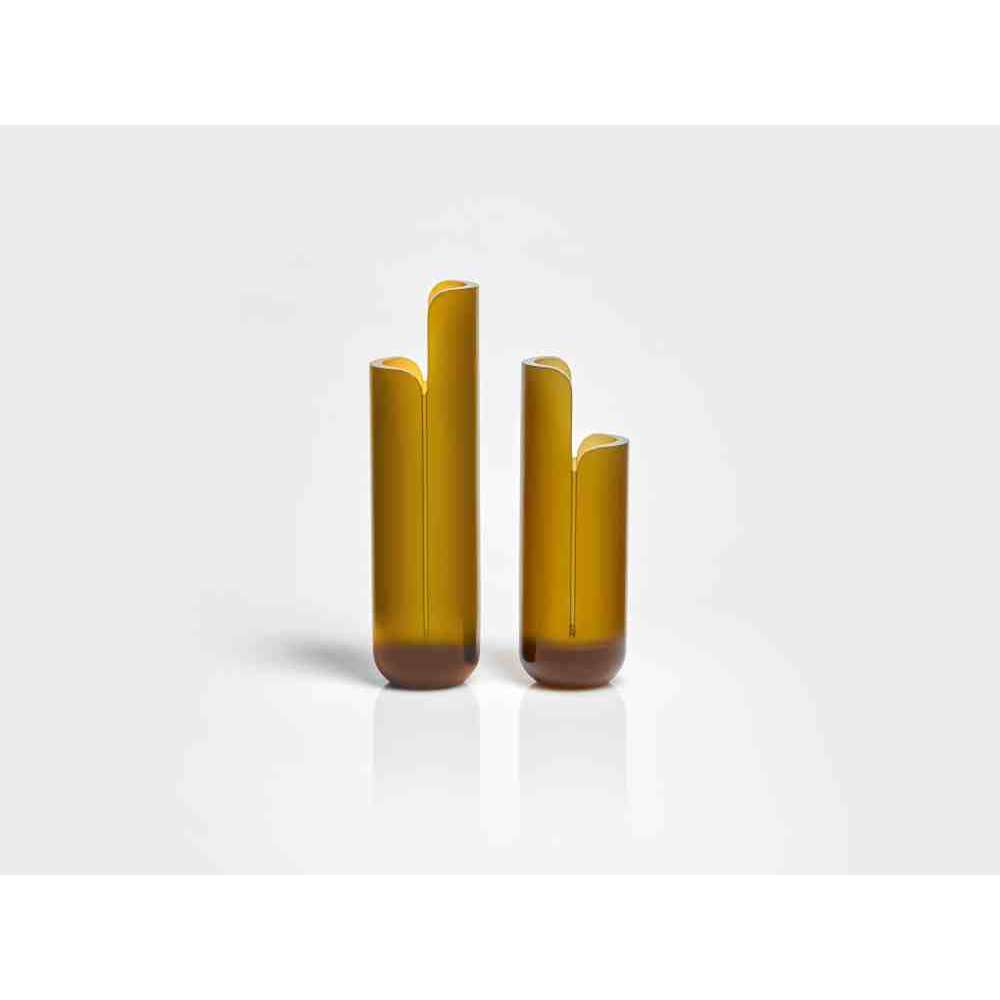o różnych wysokościach i średnicach zwęża się u góry tak, aby zdefiniować krawędź, górną koronę, która rozjaśnia obraz i zachęca oko do zbieżności w kierunku zawartości wazonu. W serii NISI integruje się z kształtem stożka bez przerwy, aby otworzyć i pomieścić wspaniały bukiet kwiatów. Wreszcie w serii MASA głębokie cięcie, wyraźny znak oddziela, ale jednocześnie łączy dwie połowy objętości, która rozwija się na wysokość, osiągając różne wysokości, nadając wazonowi niezwykły wygląd.