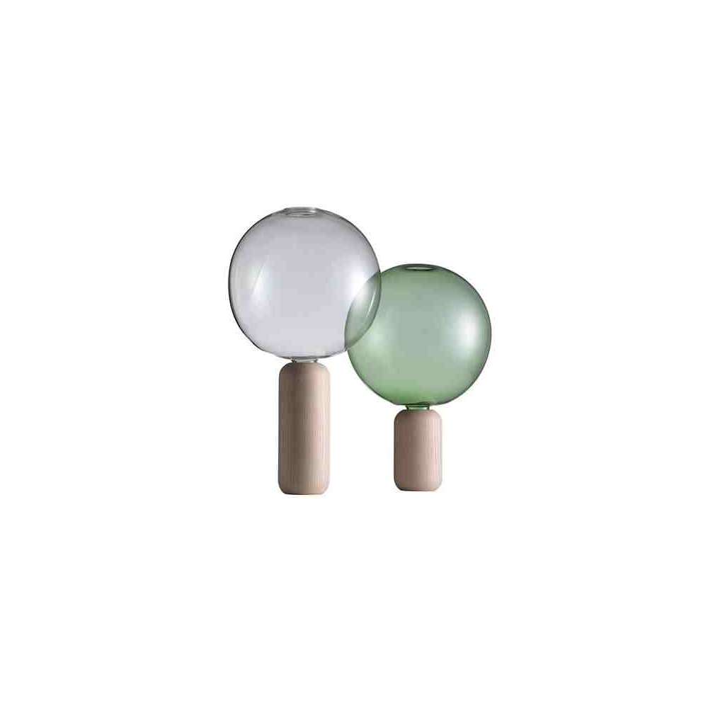 W tej kolekcji rzeźb wazonowych małe podstawy z bielonego drewna jesionowego podtrzymują duże kule wykonane z dmuchanego szkła borokrzemianowego: uzyskany efekt wizualny jest interesującą przeciwwagą między pełnią a pustką, kruchością i odpornością.