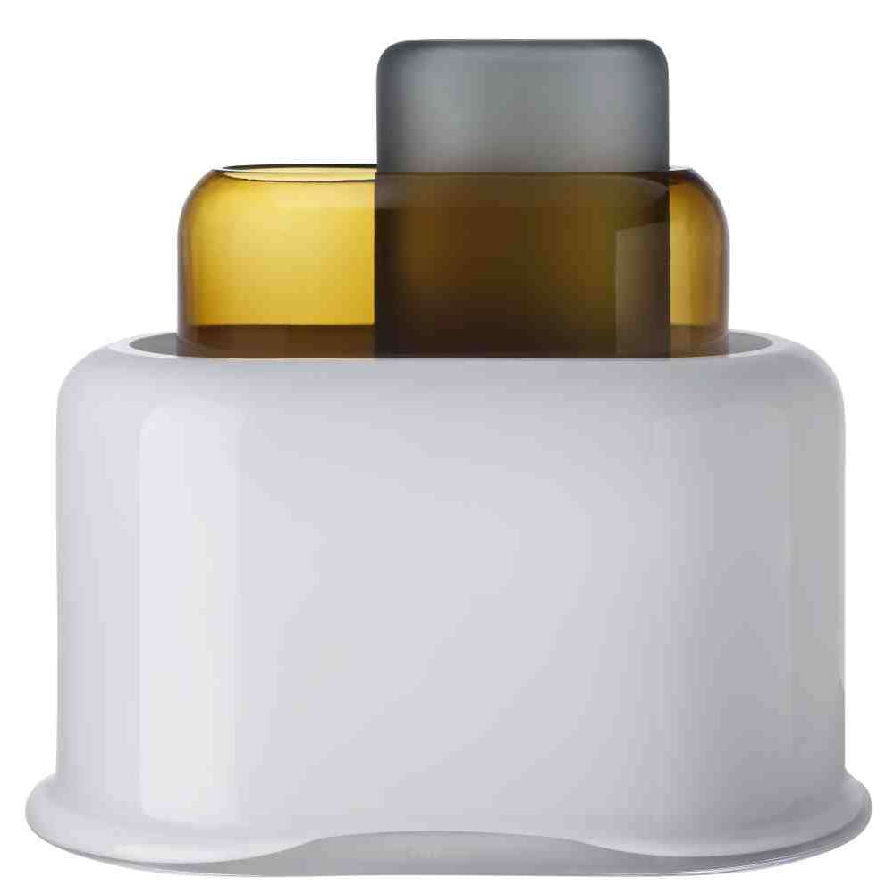 Ten wazon składa się z trzech naczyń ze szkła dmuchanego w graficznych formach, które łączą się ze sobą, pozwalając ich różne półprzezroczyste odcienie nakładają się na siebie.