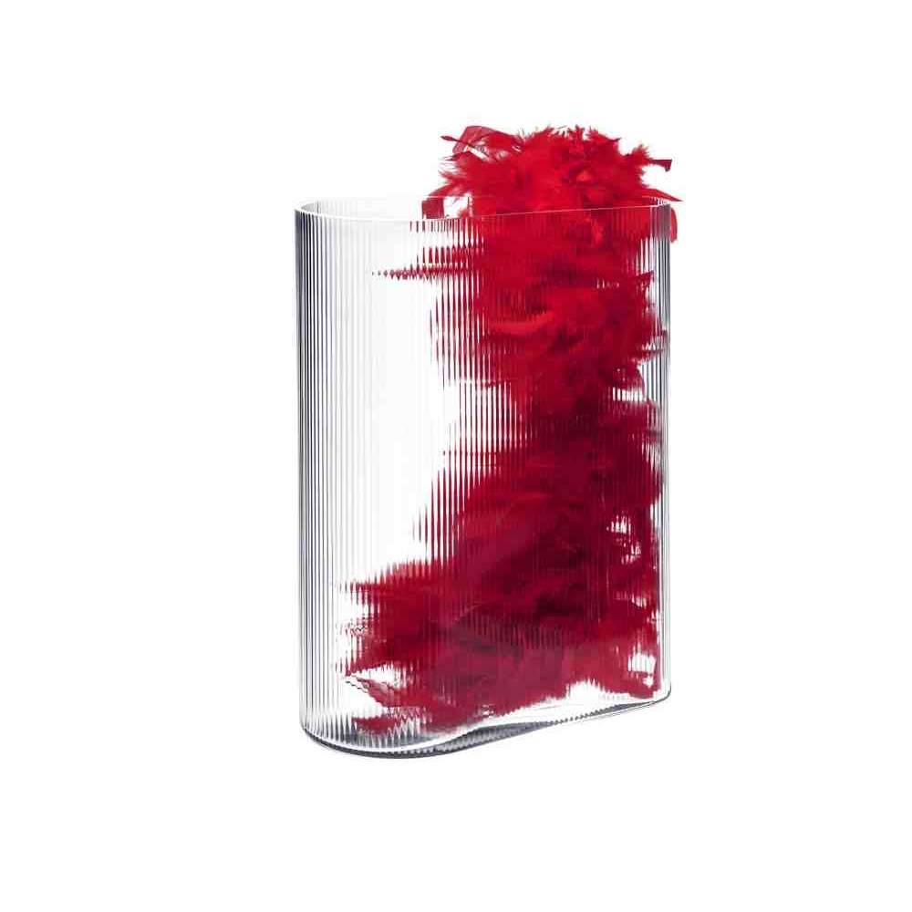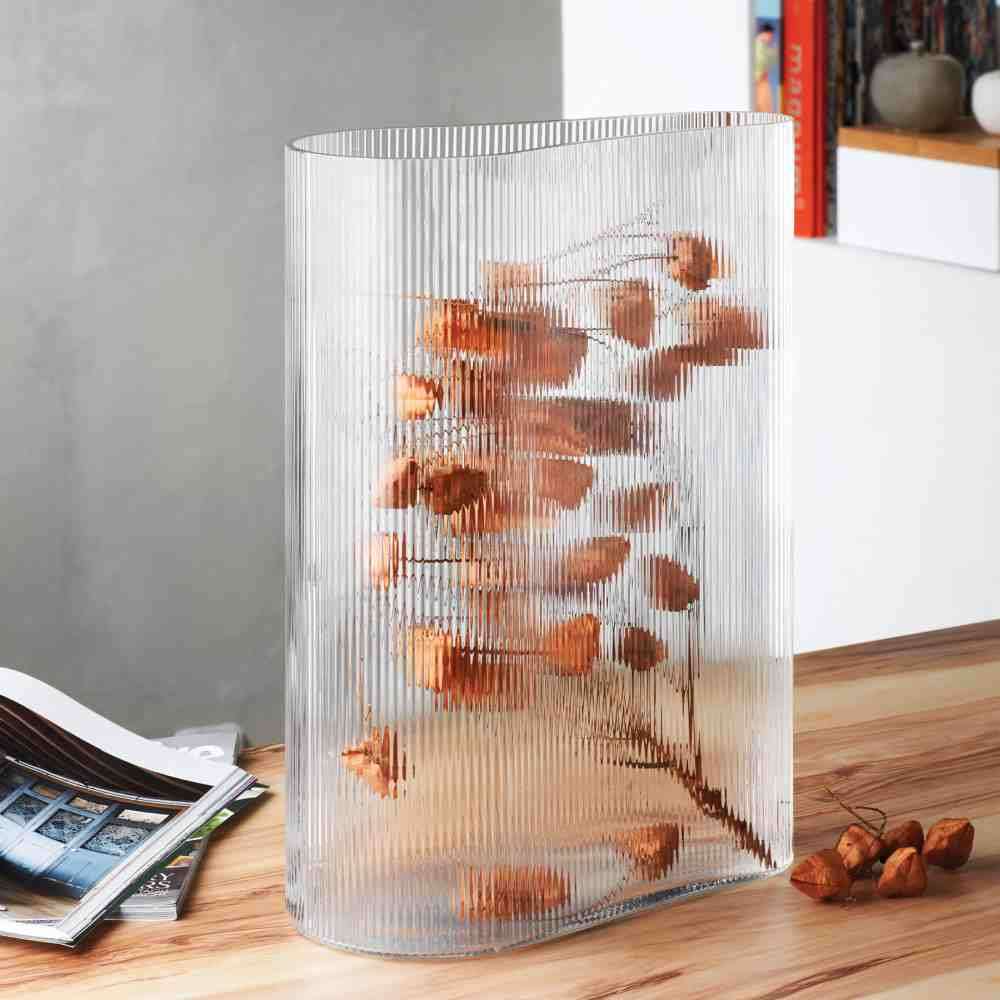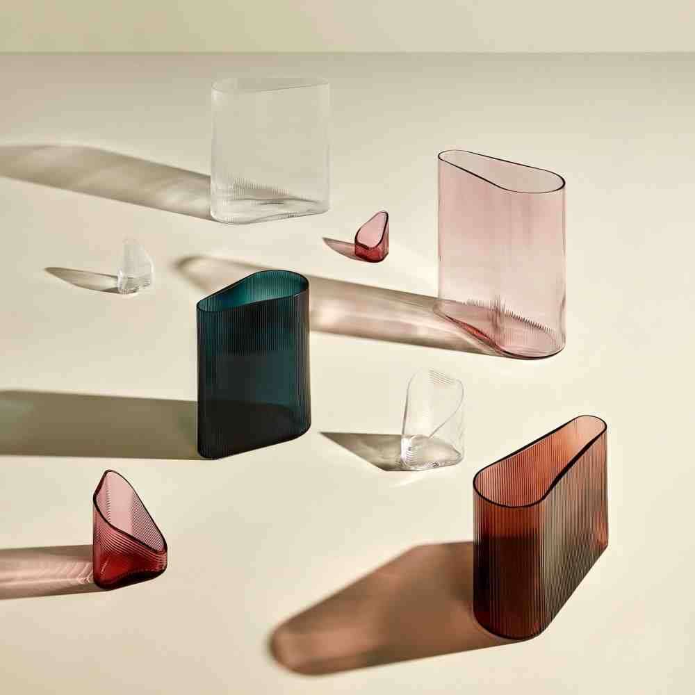 Od projektanta Tamera Nakisçi to trio wazonów wykonanych z niezwykle przejrzystego, ale falistego szkła. Efekt falowania tworzy iluzję optyczną, w niemal magiczny sposób odzwierciedlając różne kolory zawartości. Szczególnie pięknie prezentują się w tych wazonach kwiaty. Jednak szersze wersje nadają się również do przechowywania gazet, książek lub czasopism.