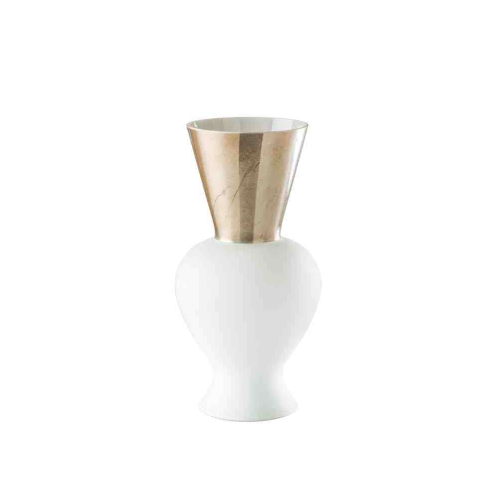 Re to wazon z opalizującego szkła z dekoracją z efektem metalu nanoszonym na gorąco i piaskowanym. Noszenie królewskiej korony nie jest łatwe, ale robi to doskonale. Wysoki i dumny, rządzi swoim szklanym imperium z elegancją i gracją wijących się form. Nosi satynowy płaszcz i koronę z efektem szlachetnego metalu.