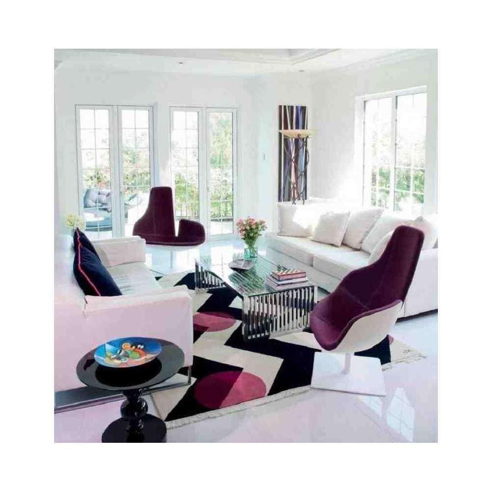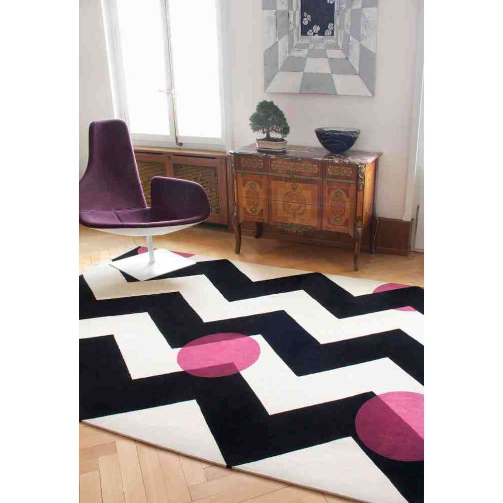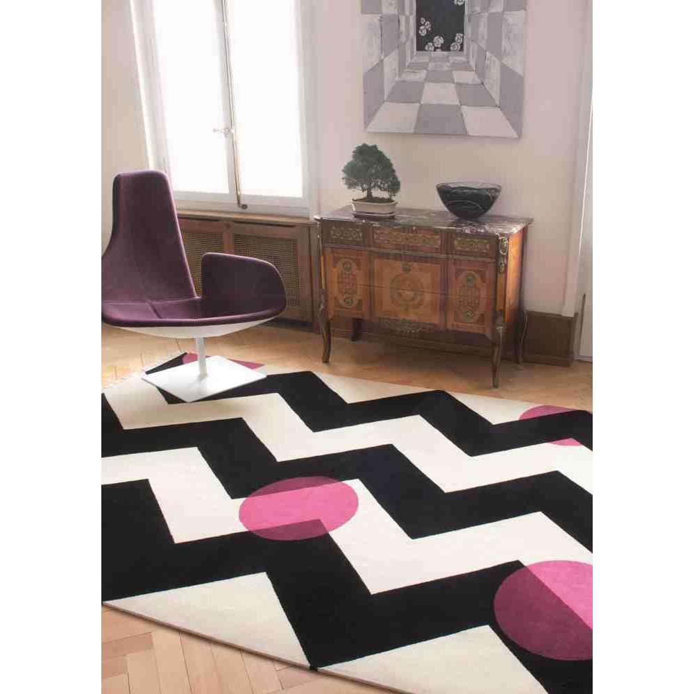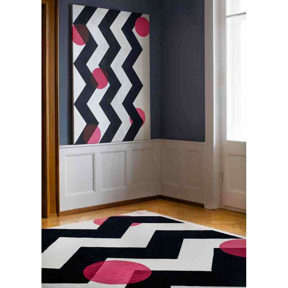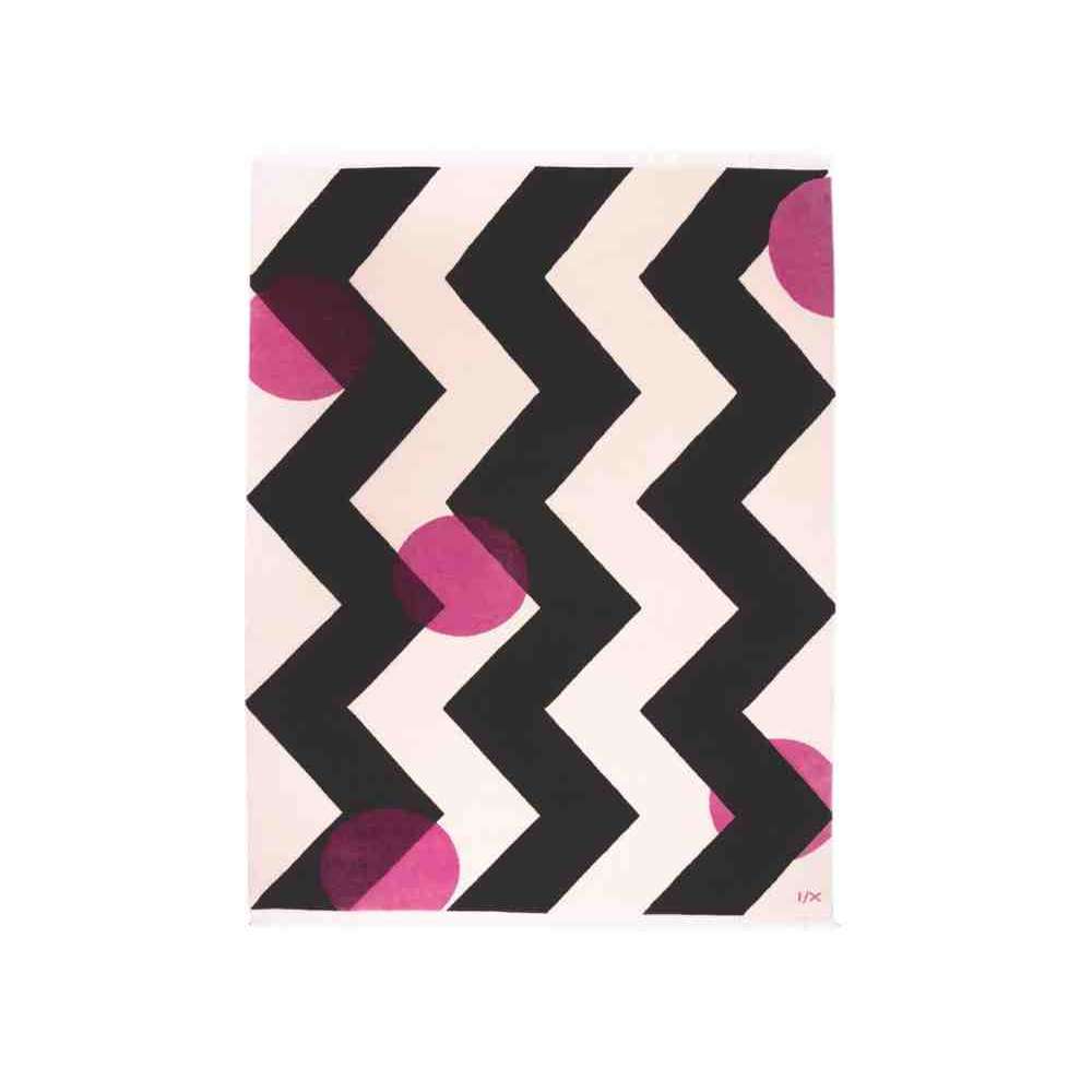 Cherry Tree Pink to ręcznie tkany wełniany dywan, to interpretacja Cecylii kwiatu wiśni, ciemnych nagich gałęzi z różowymi kwiatami wiśni, wykonana w czysto graficzny sposób.