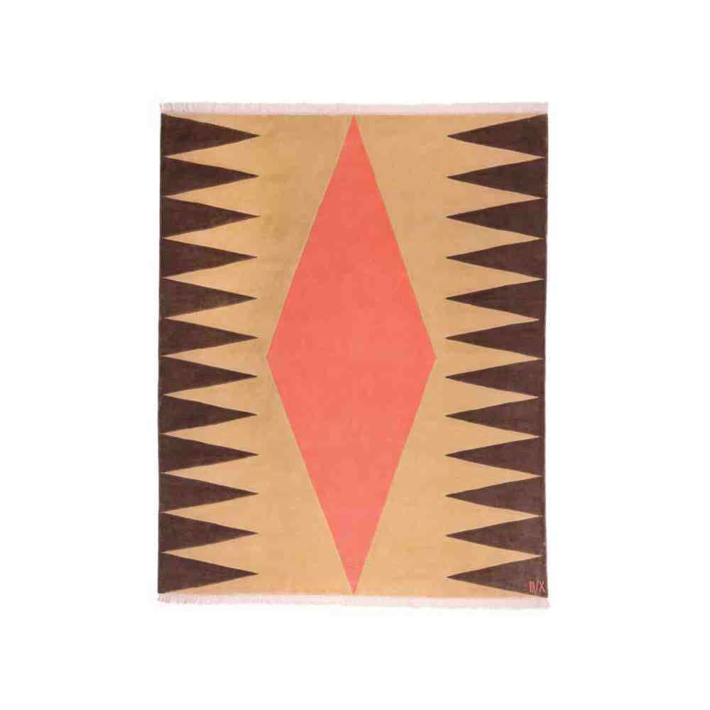 Interior Orange to ręcznie tkany dywan z wełny nowozelandzkiej z wytłoczonymi elementami. Wyraziste geometryczne kształty w ciepłych kolorach. Formy są wytłaczane, aby stworzyć nowoczesne wrażenie.