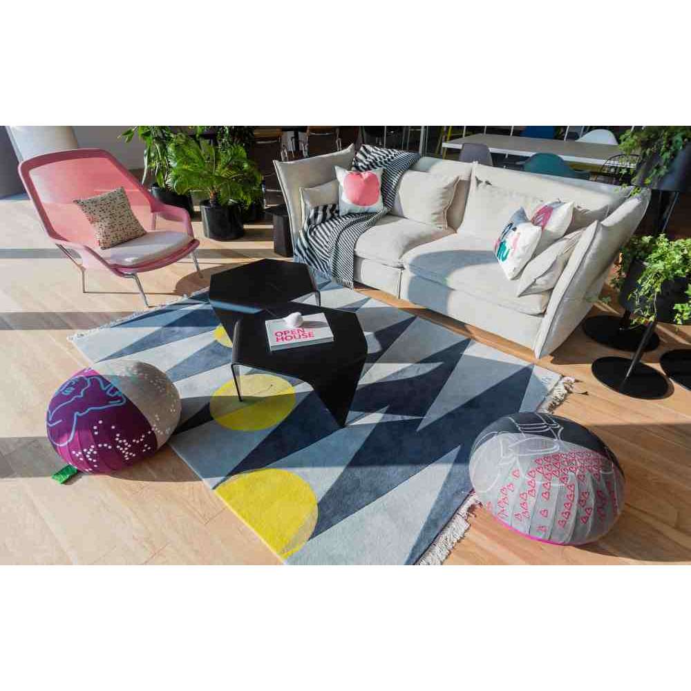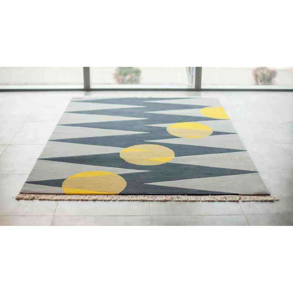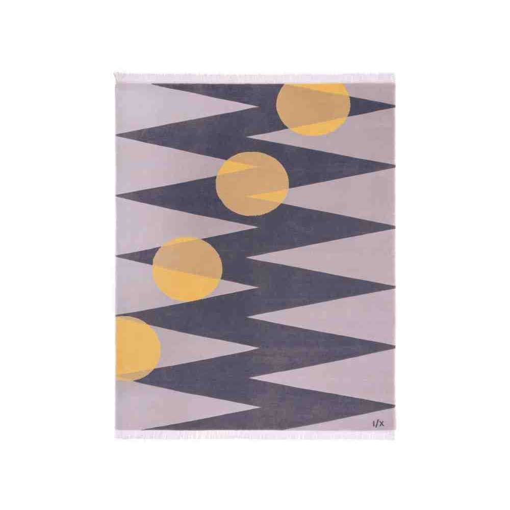 Itinerary Yellow to dywan wykonany z wełny nowozelandzkiej w odcieniach szarości i żółci. Ten ręcznie tkany dywan został zaprojektowany z przezroczystym wyglądem żółtych kropek, gdy przecinają trasę. Linie są wytłaczane, aby nadać im surowy, nowoczesny charakter.