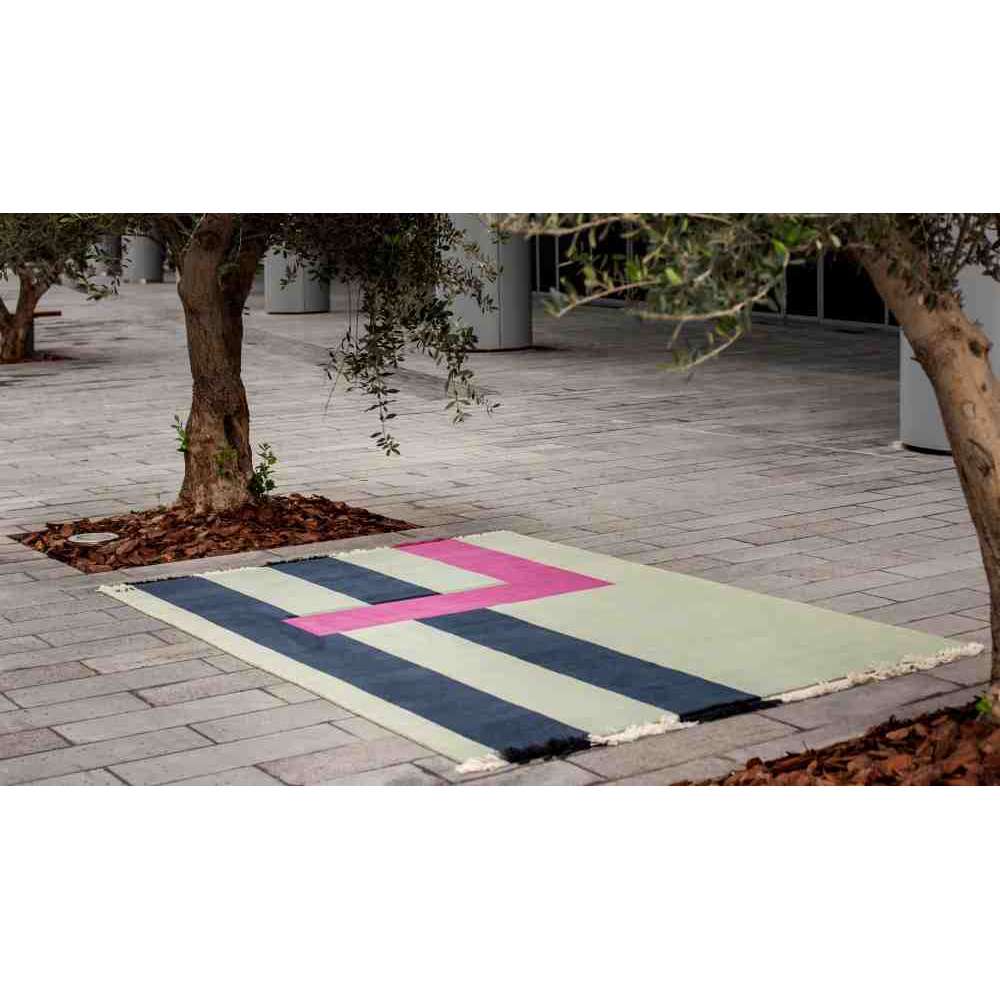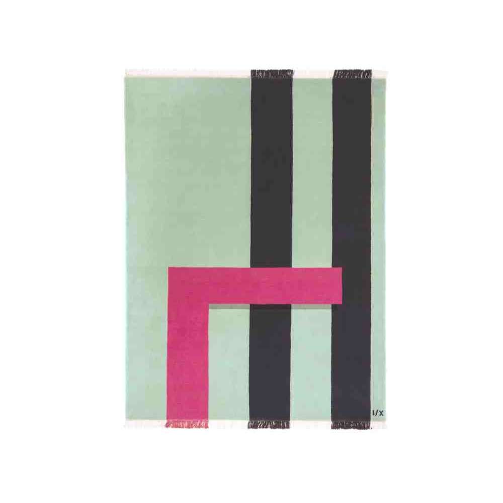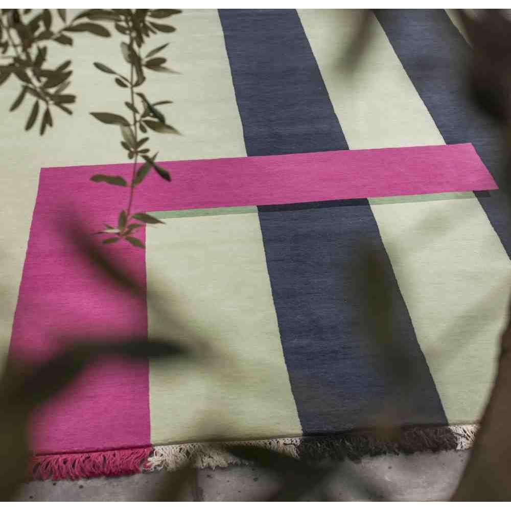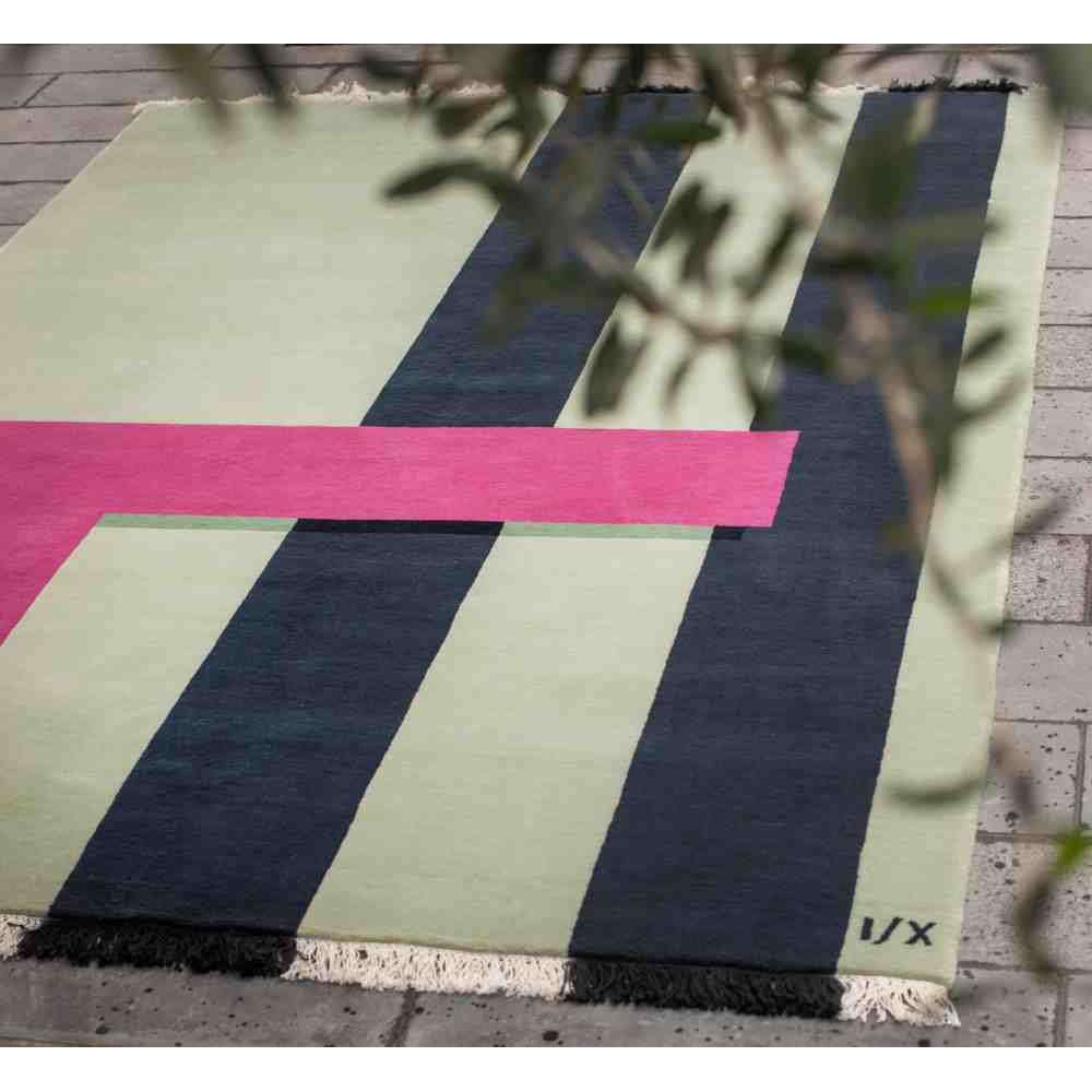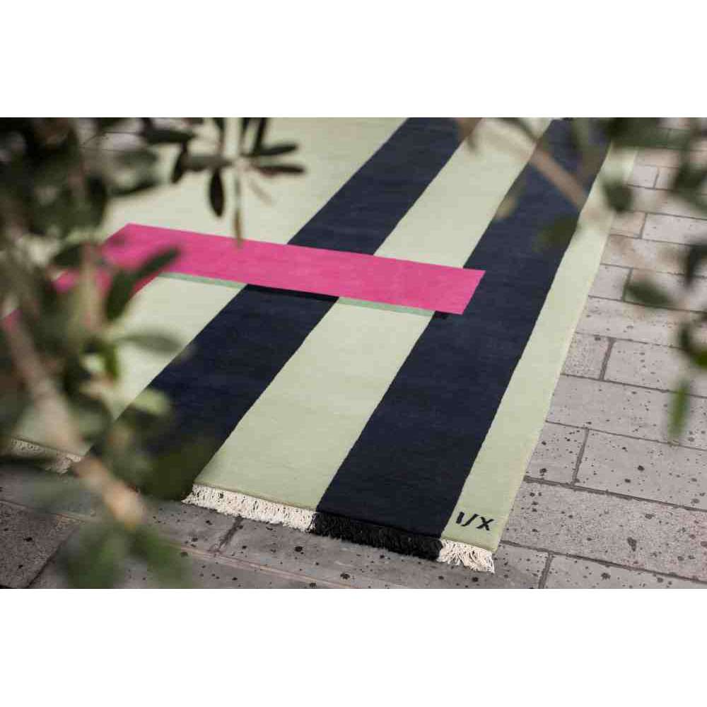 Łączenie to ręcznie tkany dywan wykonany z wełny nowozelandzkiej w Indiach. Odważna czarna linia kontrastuje z jasnozielonym kolorem. Linia fuksji przechodzi obok czerni i daje doskonały efekt cienia.