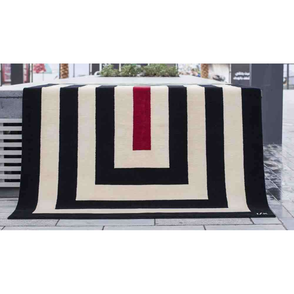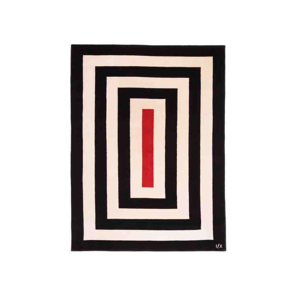 Środkowy to ręcznie tkany dywan z wełny nowozelandzkiej o ściśle geometrycznym wzorze.