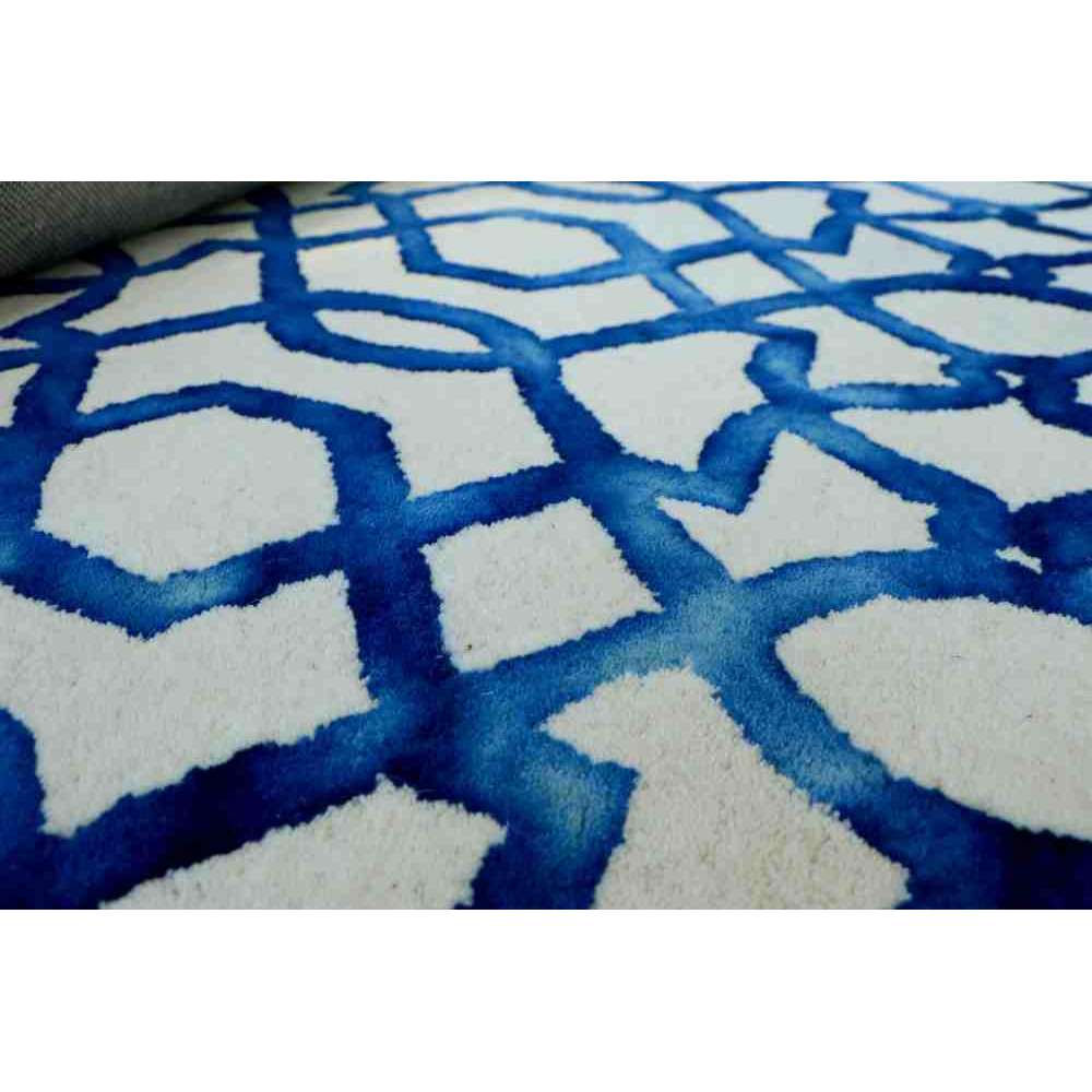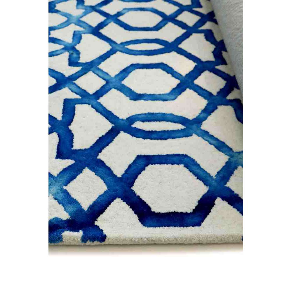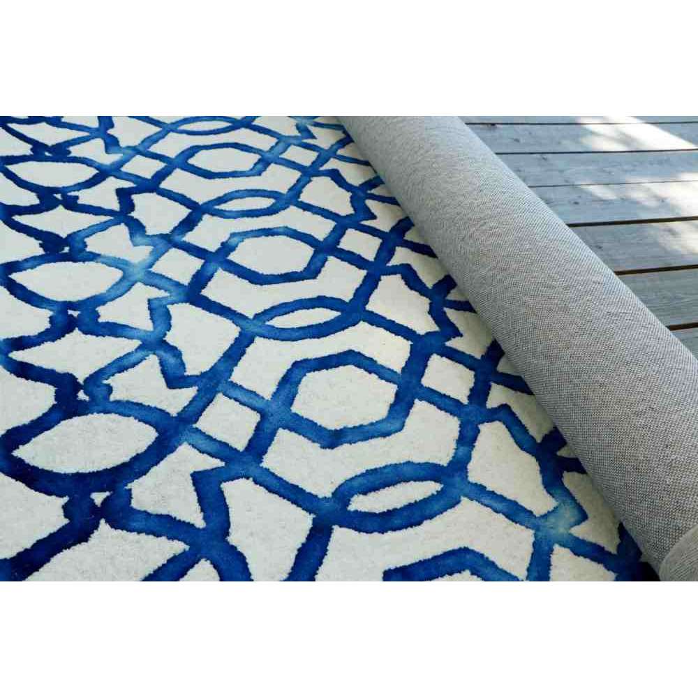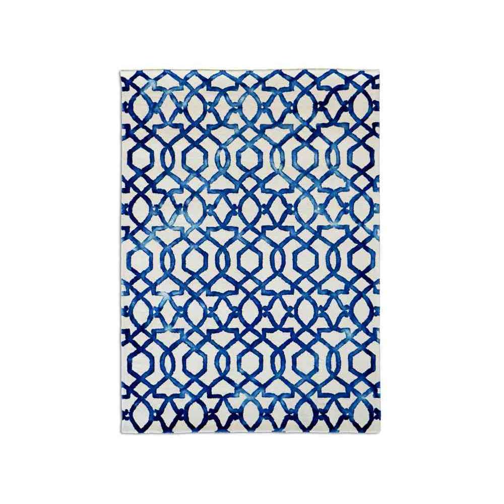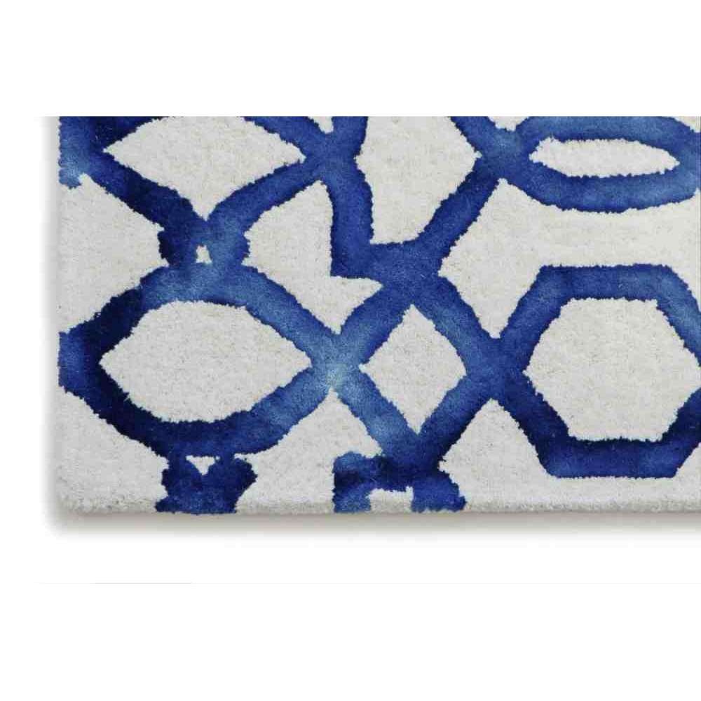 Wzór lub zazębiające się geometryczne kształty, zaprojektowane przez Deannę Comellini, są ręcznie malowane nietoksycznymi wykrojnikami w żywym niebieskim kolorze indygo na naturalnym tle, co daje graficzny, a jednocześnie klasyczny wygląd.