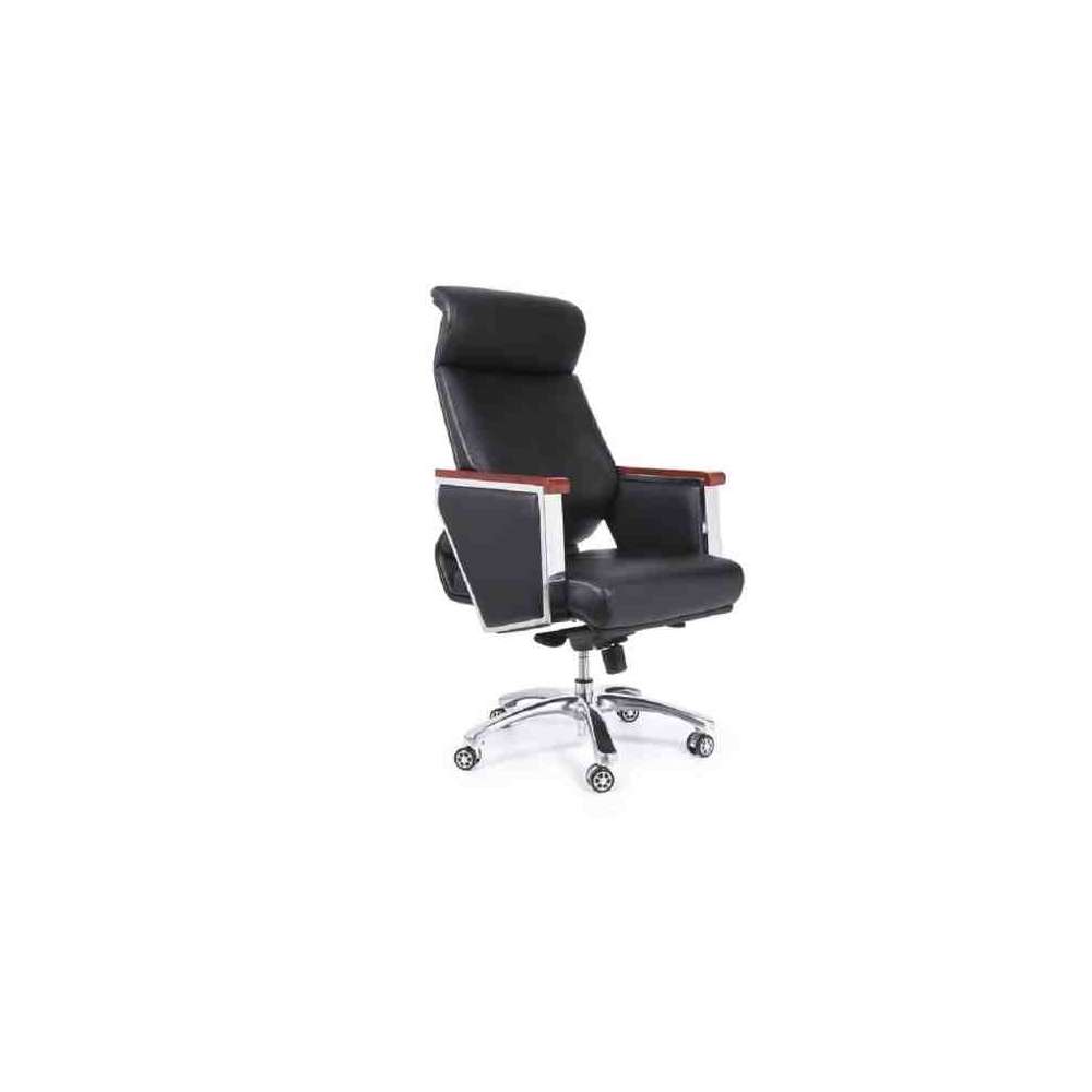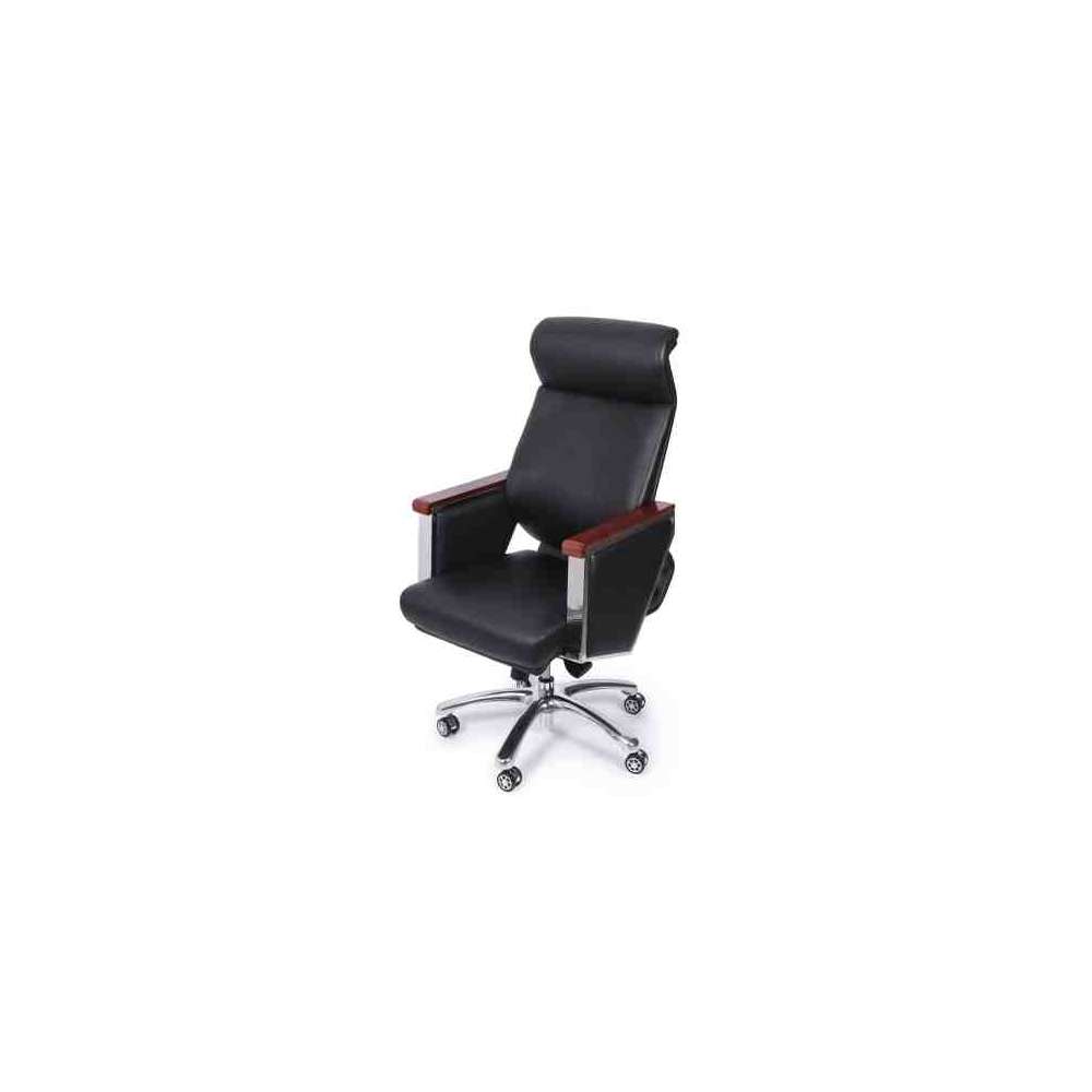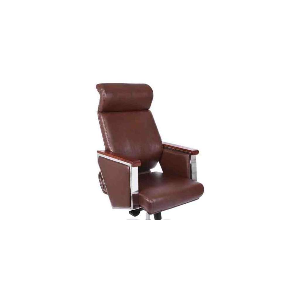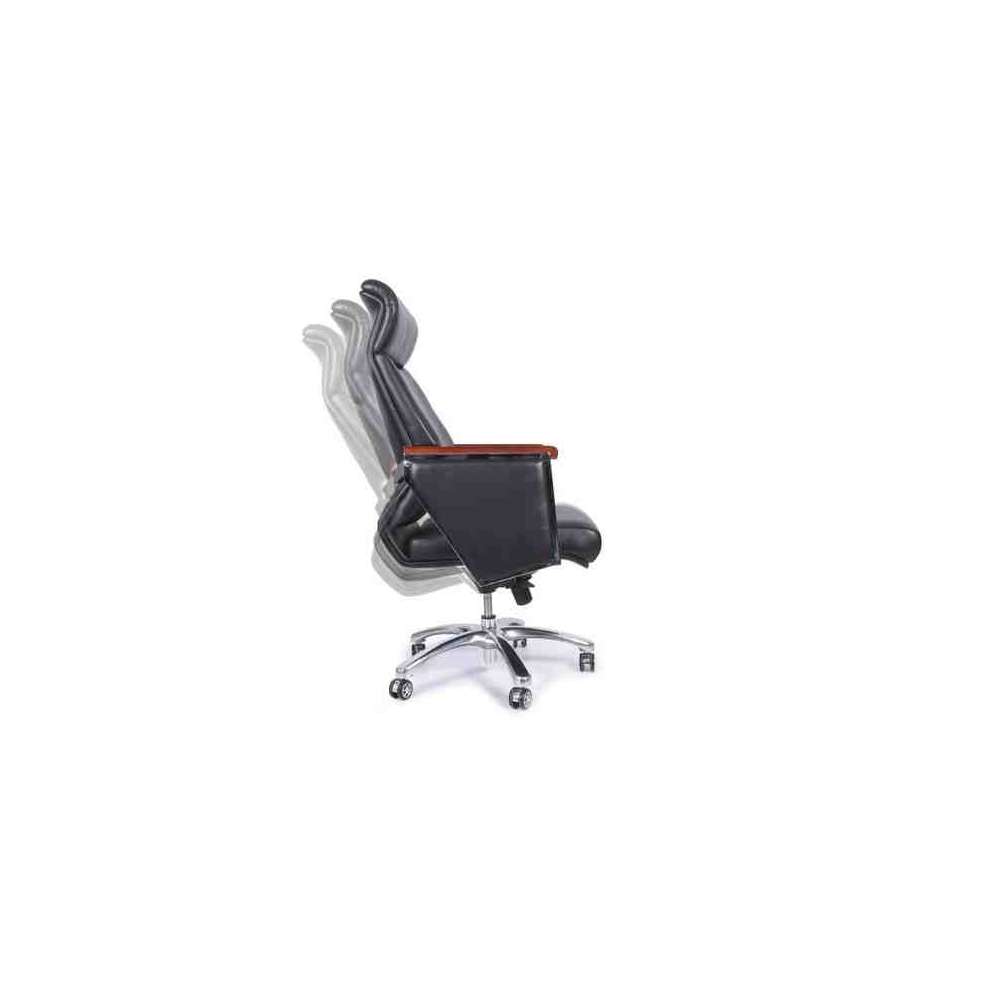 Elegance to tapicerowany i ergonomiczny fotel biurowy z podłokietnikami pokrytymi drewnem orzechowym. Wyposażony jest w pięcioramienną podstawę z chromowanego metalu, tapicerkę z ekoskóry w kolorze czarnym i brązowym. Siedzisko posiada regulowaną wysokość oraz funkcję bujania z blokadą.