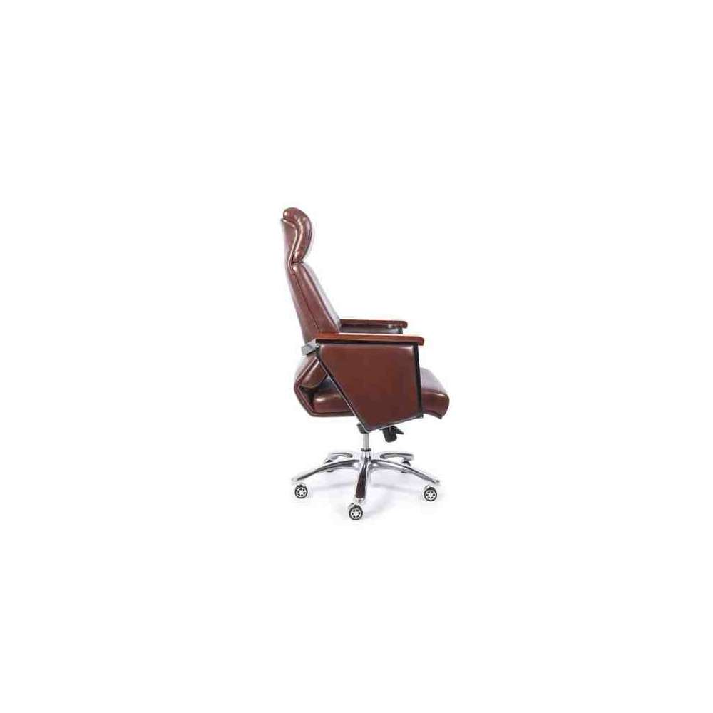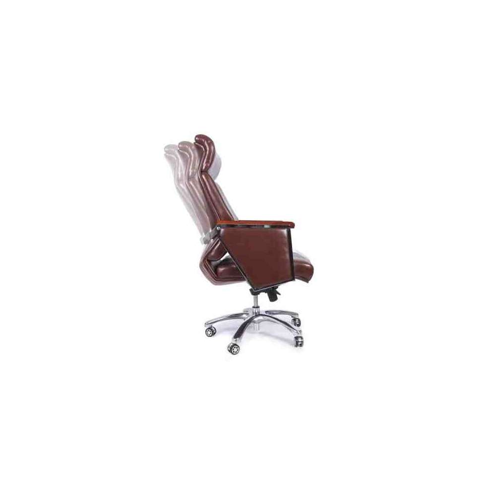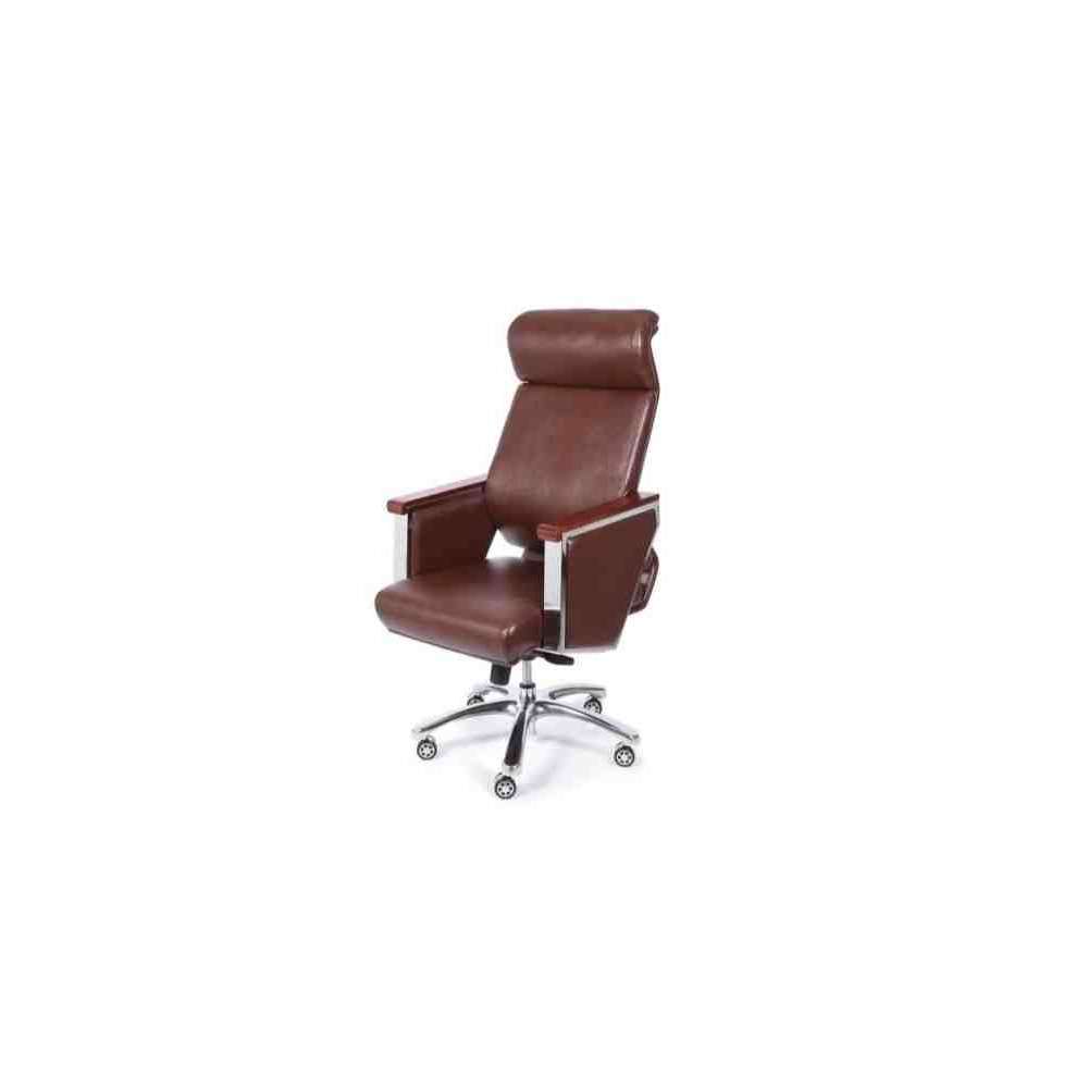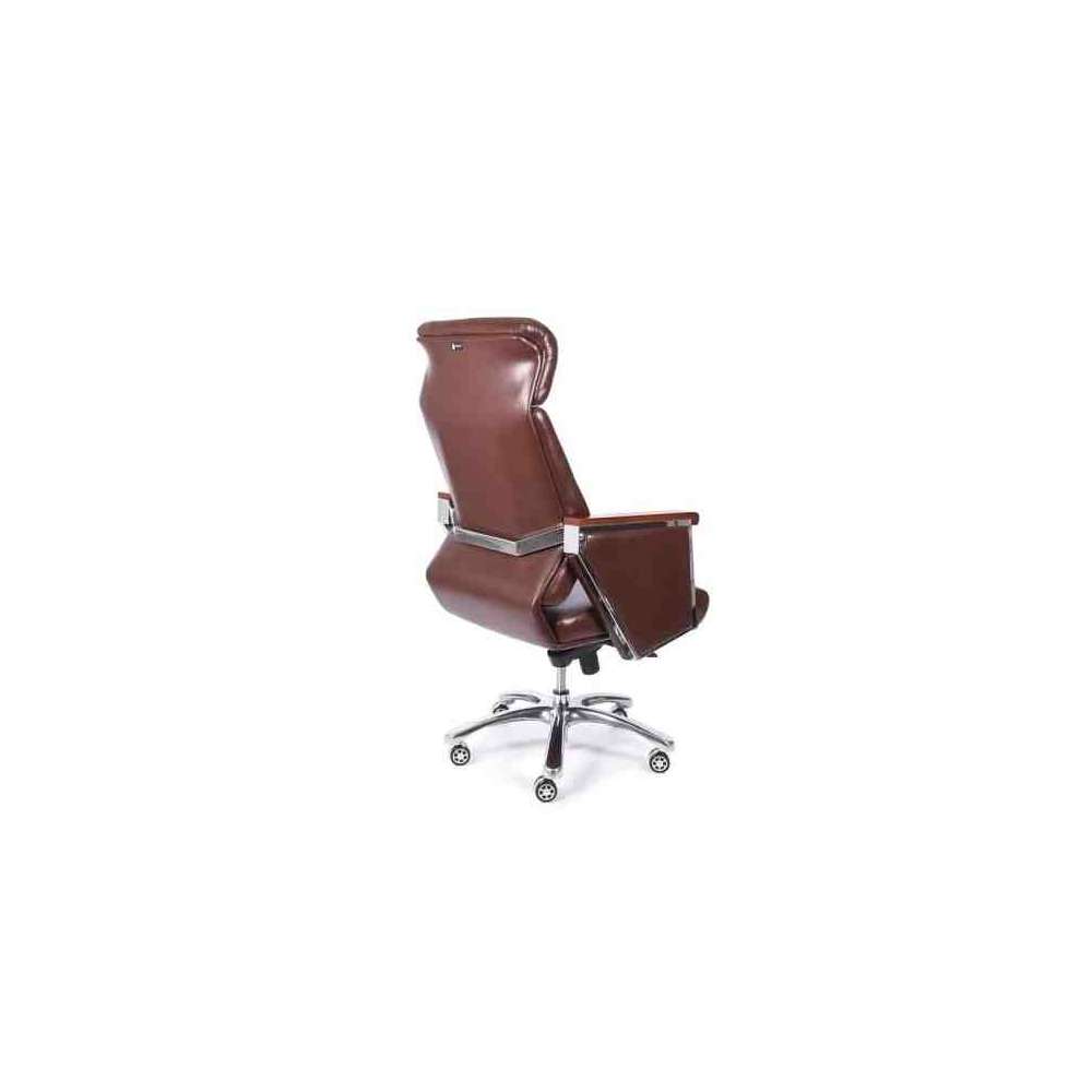 Elegance to tapicerowany i ergonomiczny fotel biurowy z podłokietnikami pokrytymi drewnem orzechowym. Wyposażony jest w pięcioramienną podstawę z chromowanego metalu, tapicerkę z ekoskóry w kolorze czarnym i brązowym. Siedzisko posiada regulowaną wysokość oraz funkcję bujania z blokadą.
