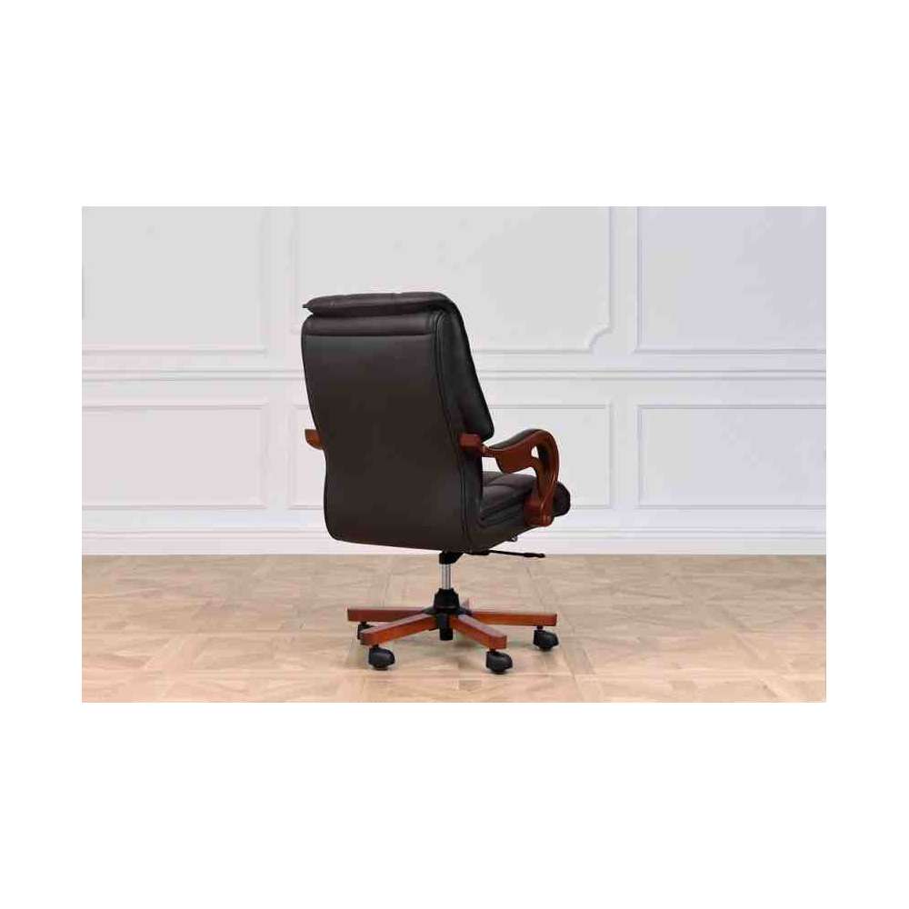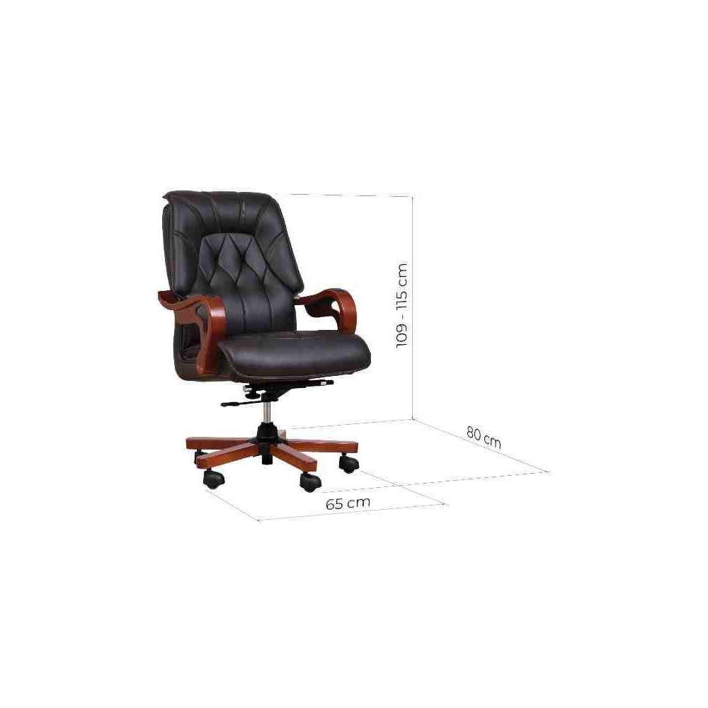 Makler to profesjonalny fotel biurowy o drewnianej konstrukcji i tapicerce z prawdziwej skóry w kolorach czarnym, beżowym i brązowym. Siedzisko jest regulowane na wysokość, a funkcja huśtawki jest zamykana.