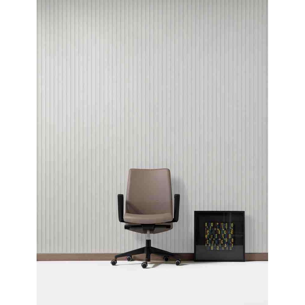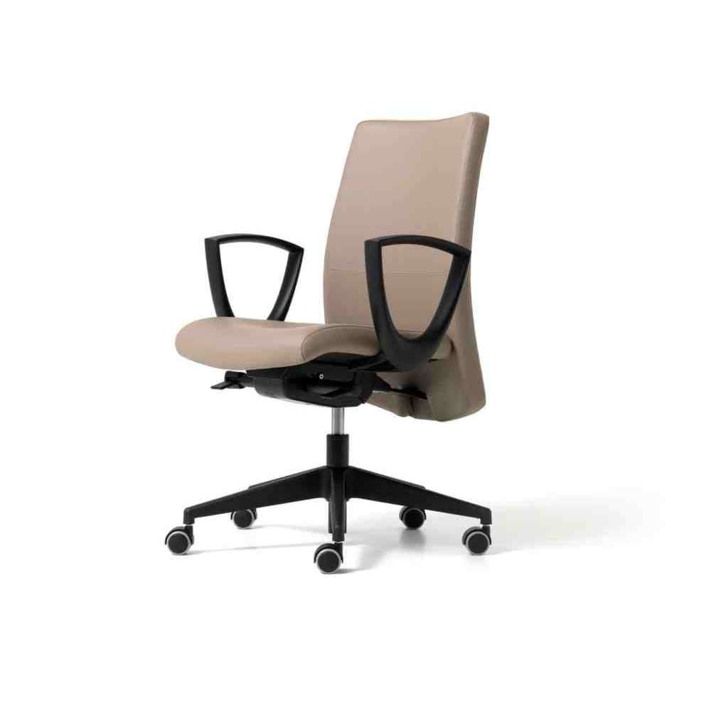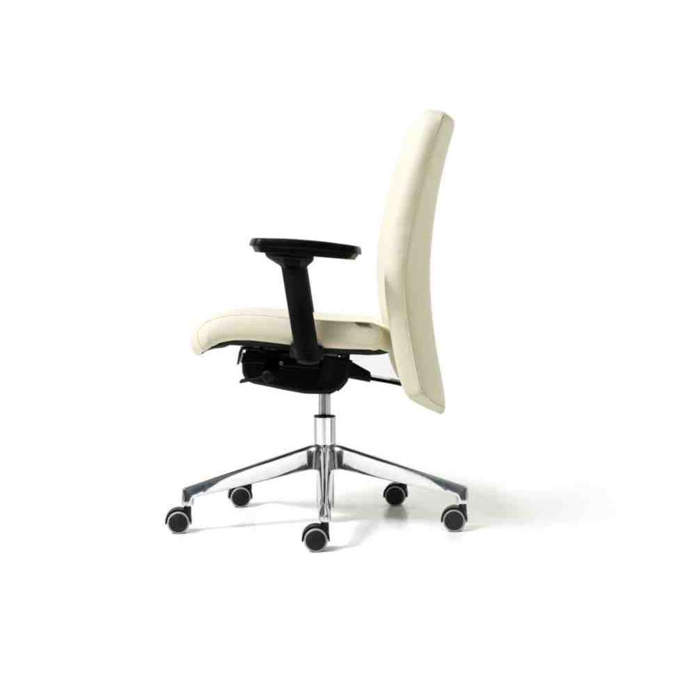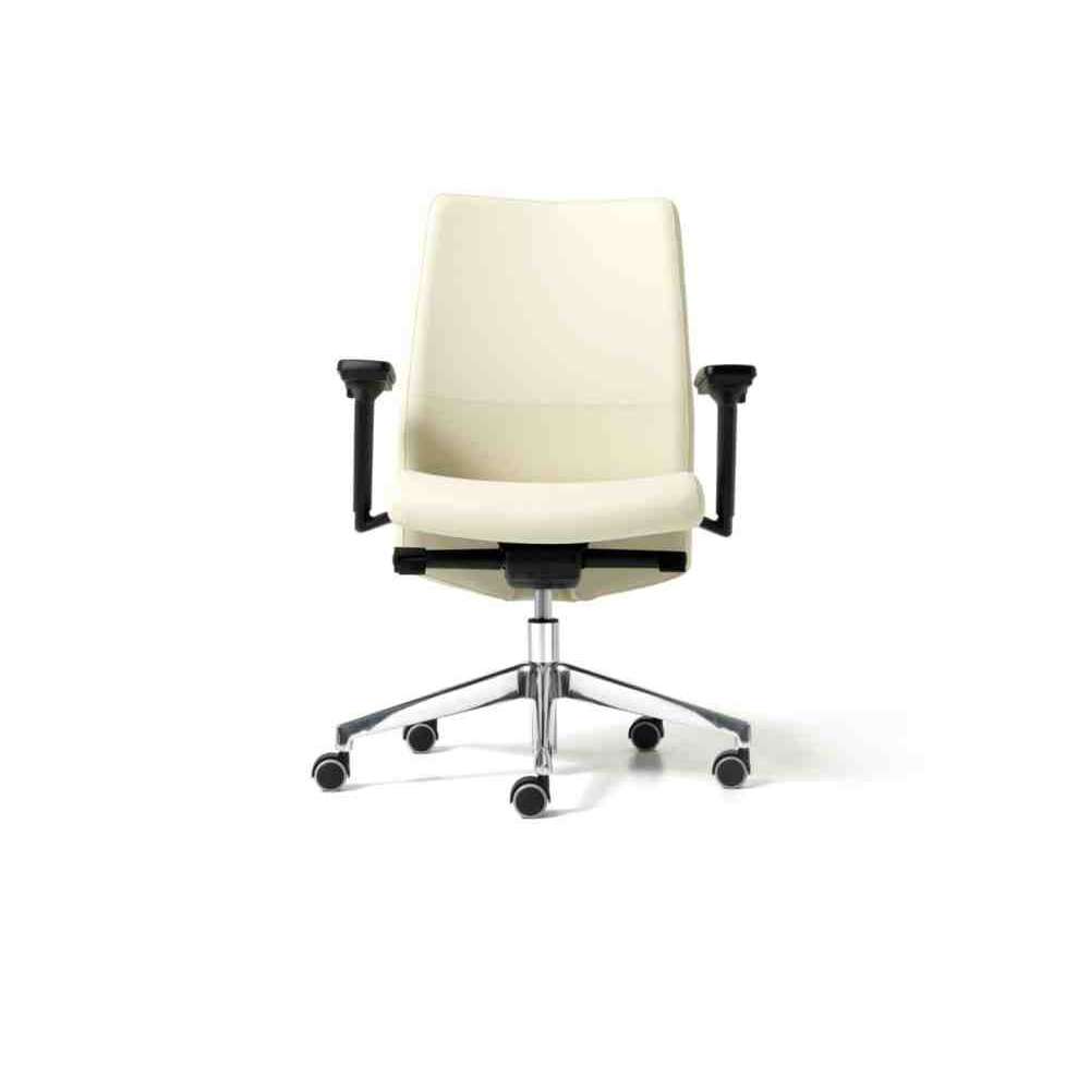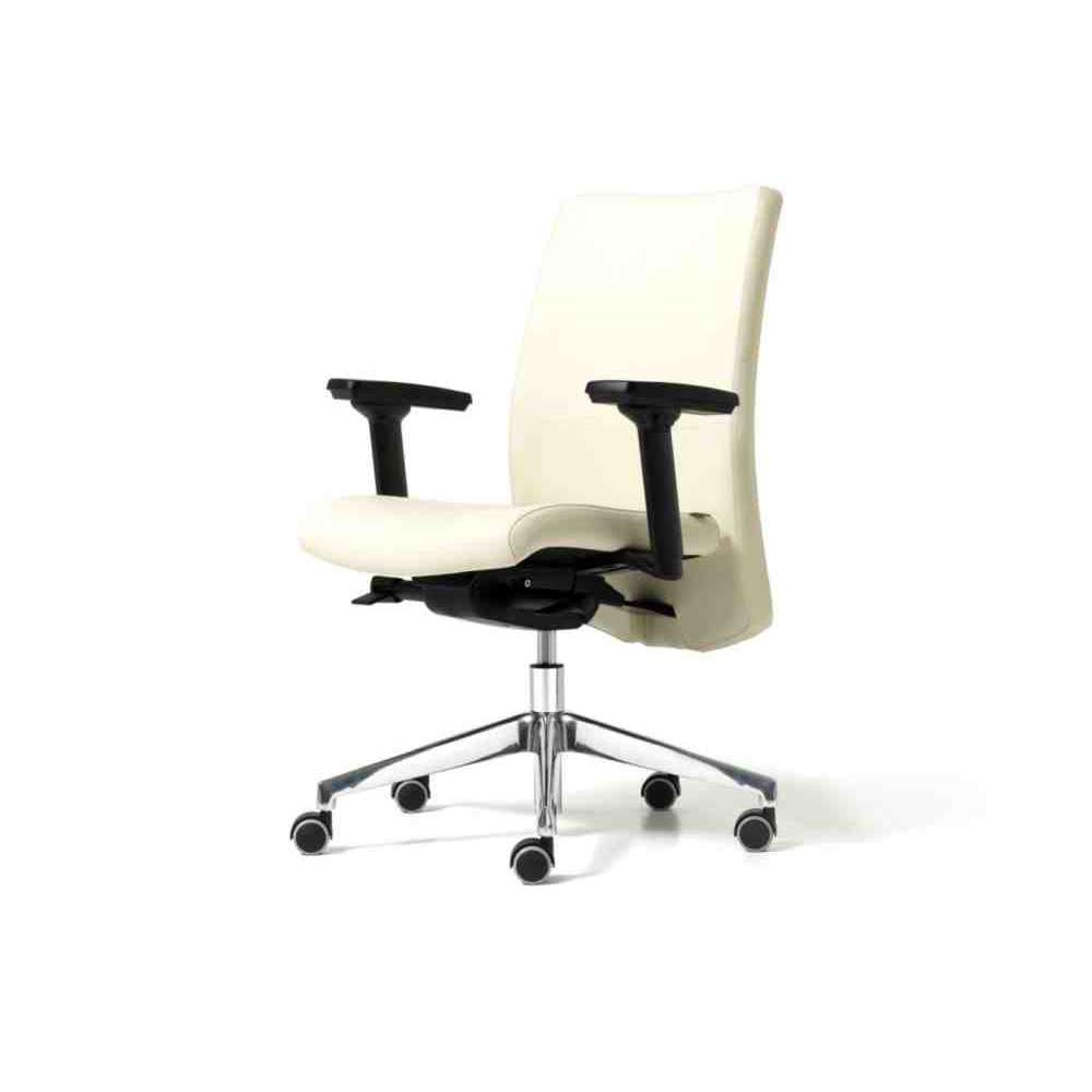 Duke to Elegancki i niezwykle wygodny fotel gabinetowy z możliwością wyboru oparcia: średnia wysokość; lub wysoko z zagłówkiem. Siedzisko i oparcie ze sklejki bukowej i pianki poliuretanowej. Mechanizm Syncro blokowany w pięciu pozycjach, z regulacją naciągu w zależności od masy ciała użytkownika, mechanizmem antywstrząsowym i podnośnikiem gazowym. Pięcioostrzowy czarny nylon lub polerowane aluminium na samohamujących gumowych kółkach. Opcjonalnie: podłokietniki stałe białe lub czarne; mogą być również regulowane 1d lub 3d.