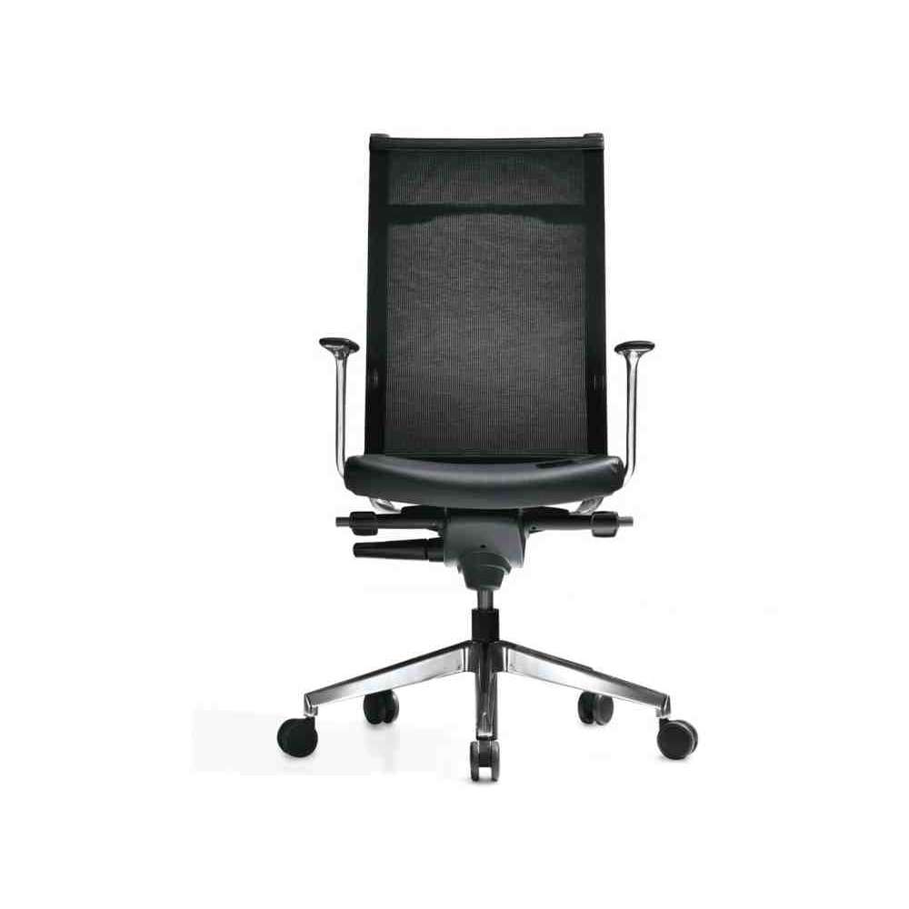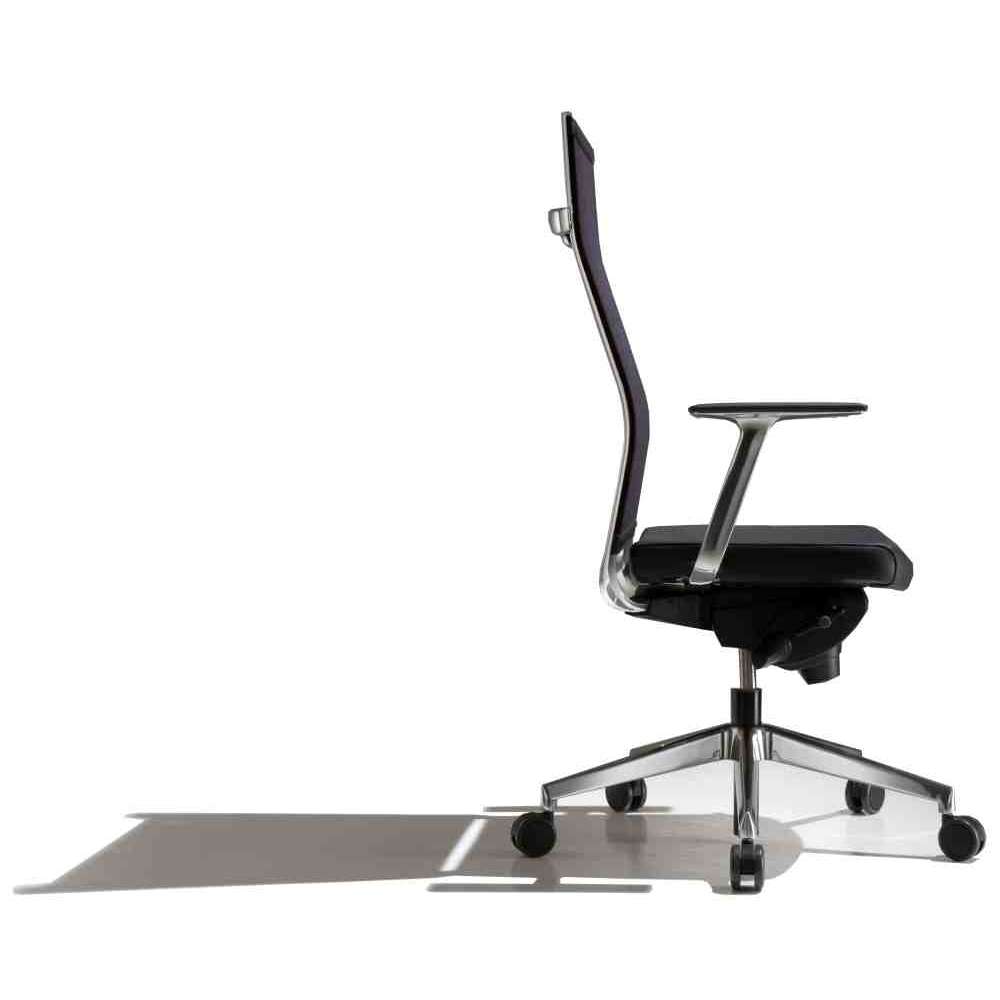 Seria foteli o eleganckim designie z oparciem z siatki wspartej na polerowanych profilach aluminiowych.