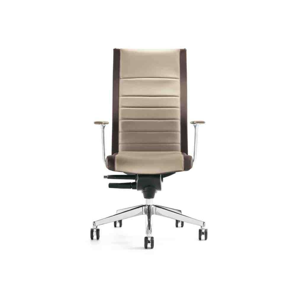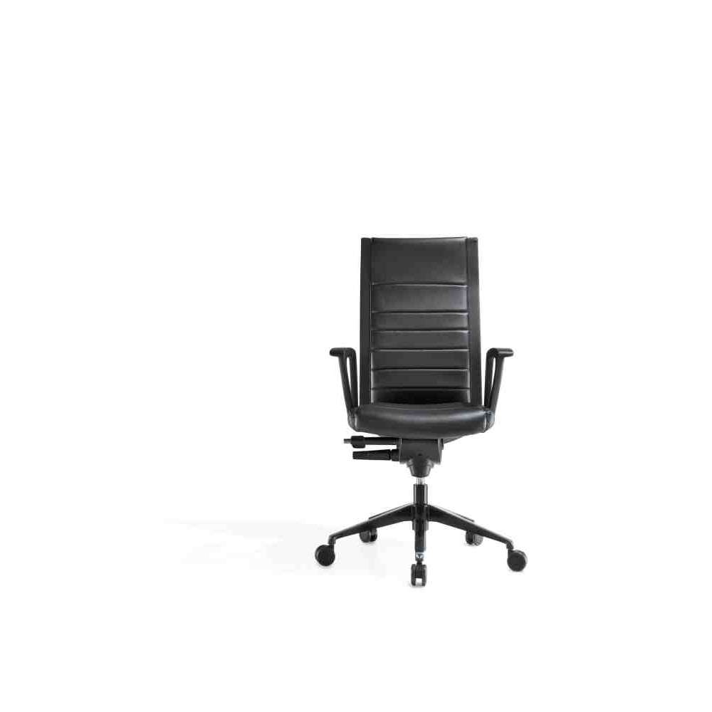 Fotel Executive z siedziskiem i oparciem w pełni tapicerowanym i bokami w imitacji skóry; profile oparcia z polerowanego aluminium.