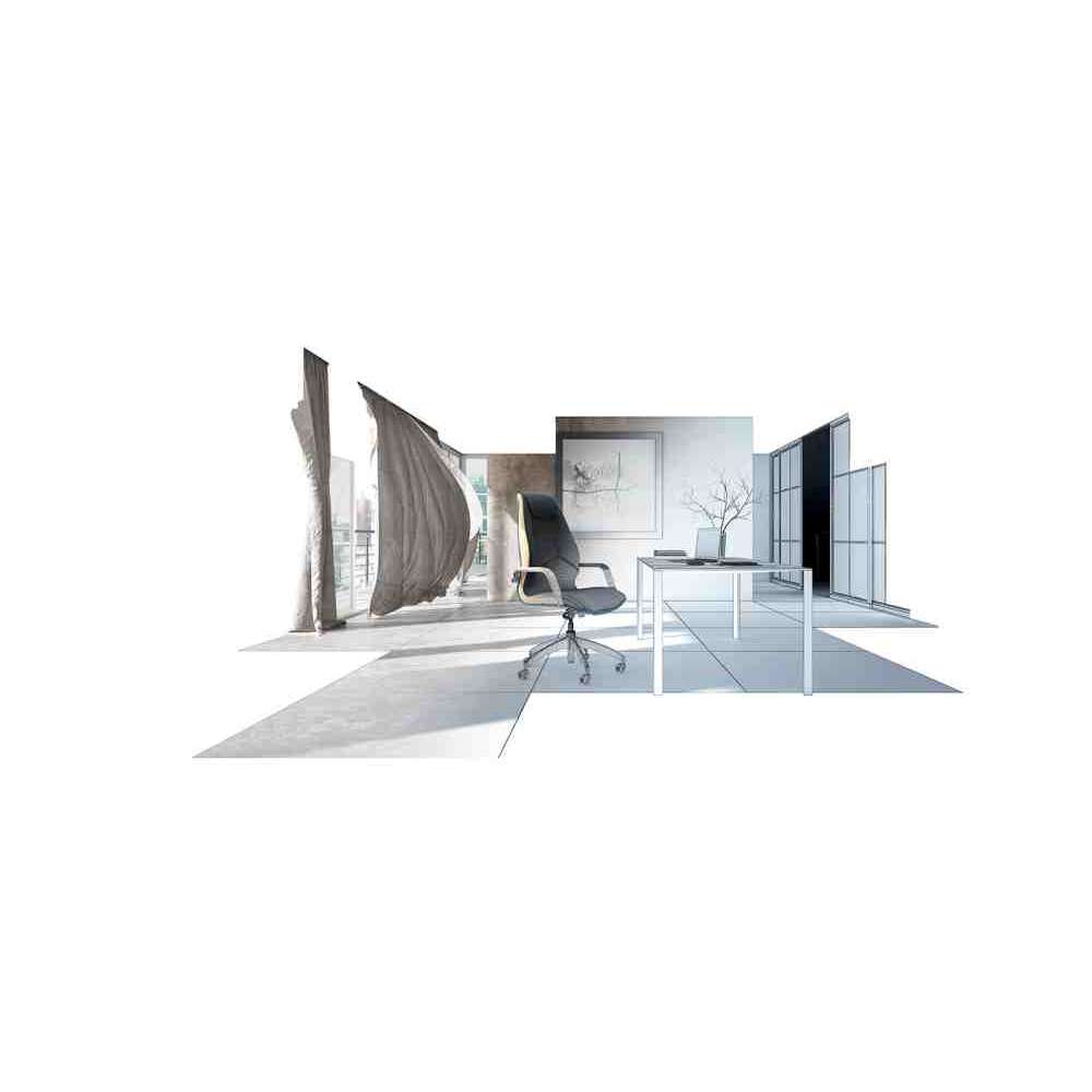 Kolano-tilt z 5 pozycjami blokowania i indywidualną kontrolą napięcia. Struktura wewnętrzna ze sklejki bukowej. Wyściółka z wtryskiwanej na zimno i ognioodpornej pianki uretanowej. Podłokietniki ze stali chromowanej wyściełane i tapicerowane. Podstawa z polerowanego aluminium. Samohamowne kółka nylonowe.