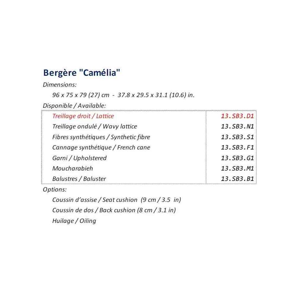 CAMÉLIA : Bergère z drewna tekowego (krata). Dostępne wzory: Krata, Krata falista, Włókno syntetyczne, Laska francuska, Tapicerka, Moucharabieh, Balustrada.