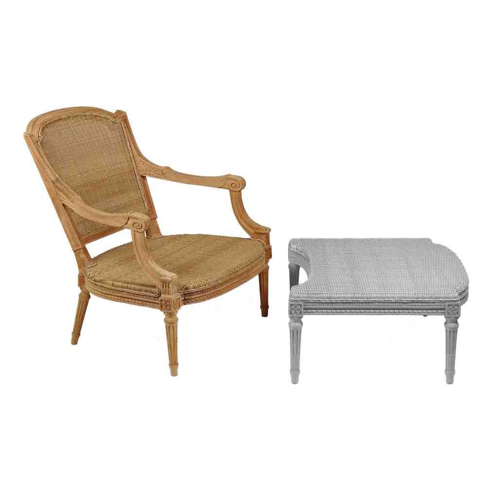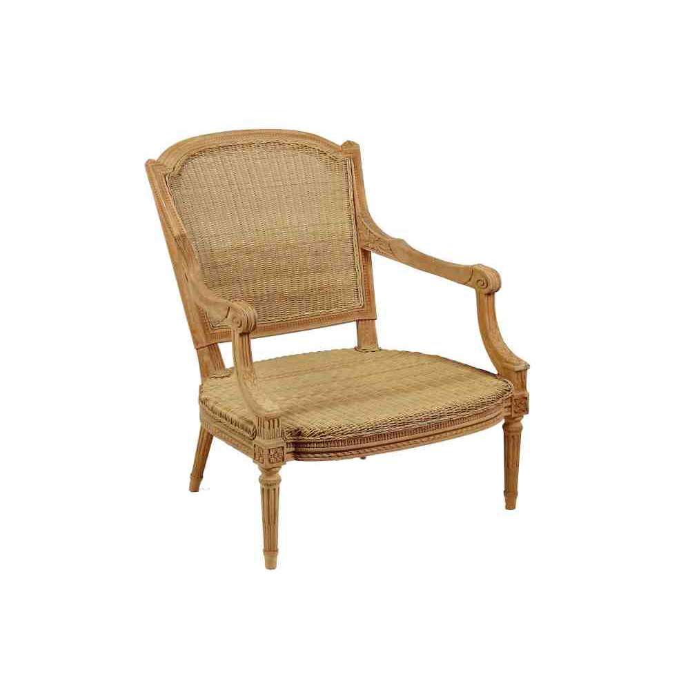 GARDÉNIA : Bergère z drewna tekowego (włókno syntetyczne). Wymiary: 90 x 80 x 72 (37) cm. Dostępne wzory: krata, włókno syntetyczne, laska francuska, tapicerka, balustrada.