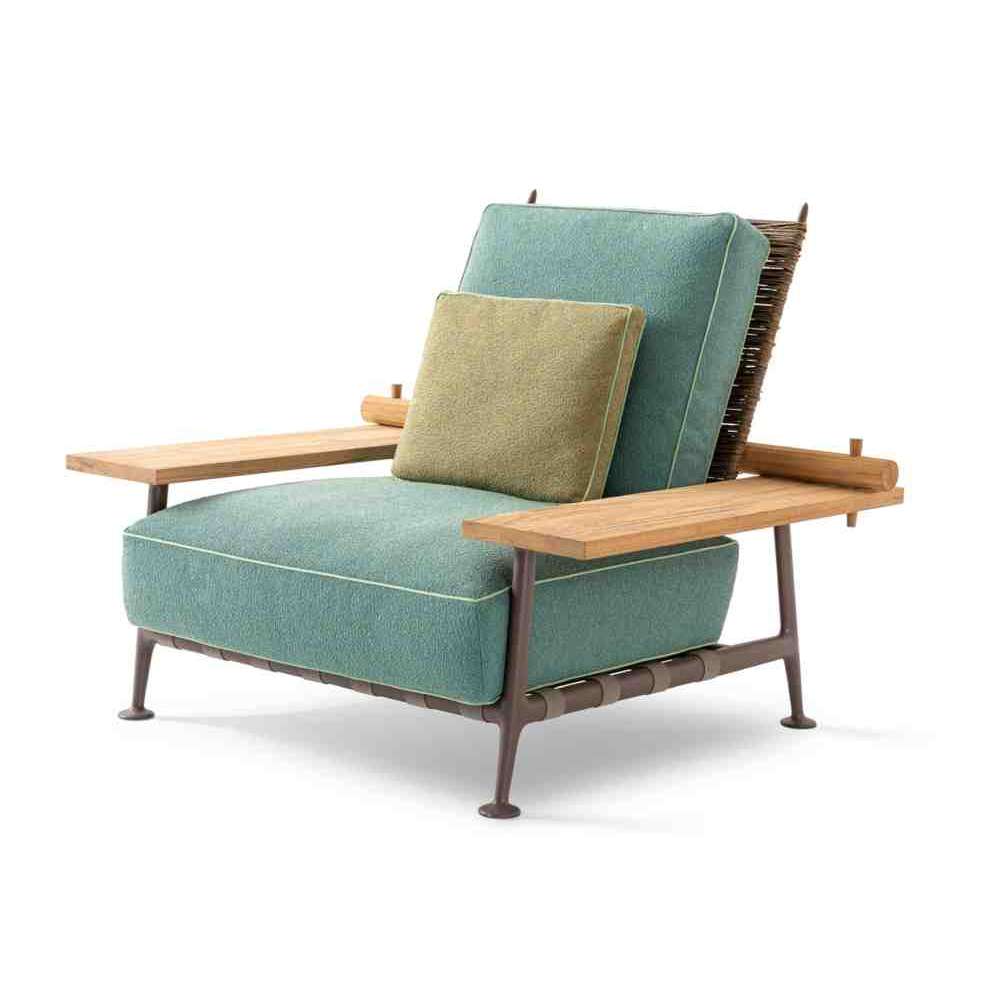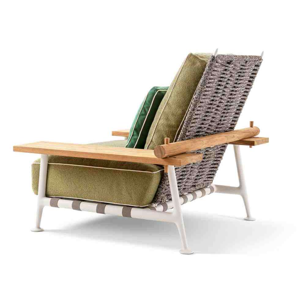 Fotel Fenc-e Nature ma organiczne formy - takie jak odlewana ciśnieniowo aluminiowa podstawa - i elementy teksturowe, które celebrują jego powinowactwo ze środowiskiem, takie jak naturalnie wyglądający podłokietnik z litego drewna tekowego z piaskowanym wykończeniem. Oparcie z ramą z malowanej stali nierdzewnej AISI 304 jest dostępne z ręcznie plecionej liny o ekskluzywnym wzornictwie lub z naturalnej, niepoddanej obróbce wierzby, użytej tutaj po raz pierwszy. Wyjątkowy komfort fotela gwarantują obszerne poduszki siedziska i oparcia z wyściółką SoloSoff©, produkt na bazie dmuchanego włókna poliestrowego i pianki zapamiętującej kształt, oraz odchylane oparcie, które można ustawić w dwóch różnych pozycjach dzięki ręcznemu mechanizmowi inspirowanemu przez architekturę azjatycką: pręt nośny z litego drewna tekowego, obrobiony tak, aby wyglądał jak gałąź, przytrzymywany dwoma drewnianymi gwoździami.