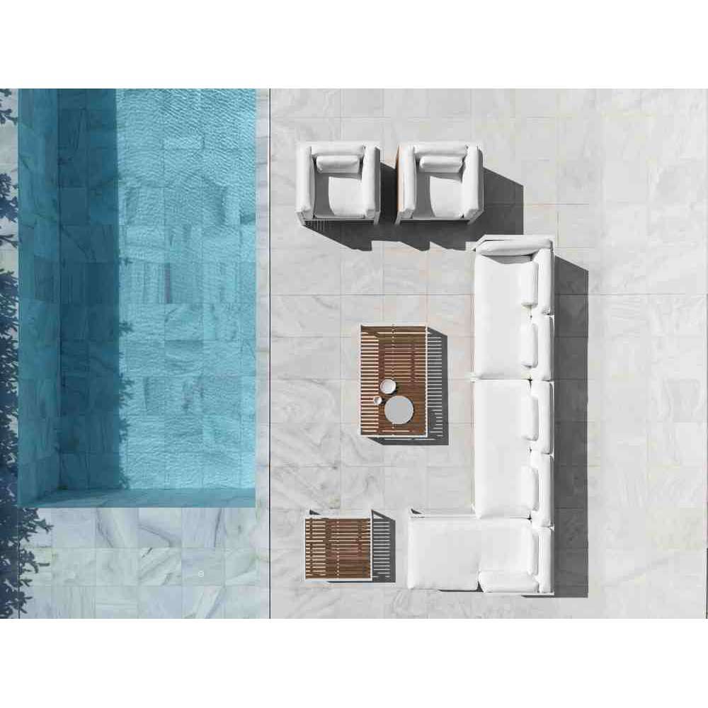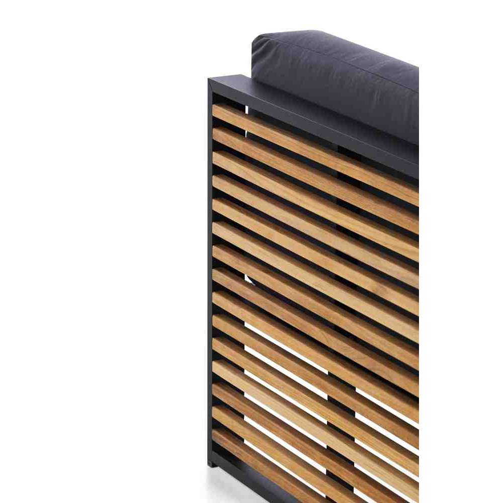 Ciepło i naturalność drewna tekowego kontrastują z chłodem aluminium, które otacza meble, fetysz GANDIABLASCO. Jego kasztanowe odcienie łączą się z kolorem anodowanego aluminium, a także ze wszystkimi lakierowanymi proszkowo wykończeniami dostępnymi w tej kolekcji.