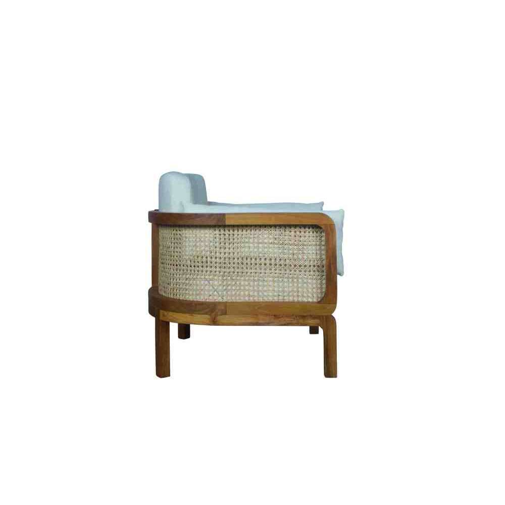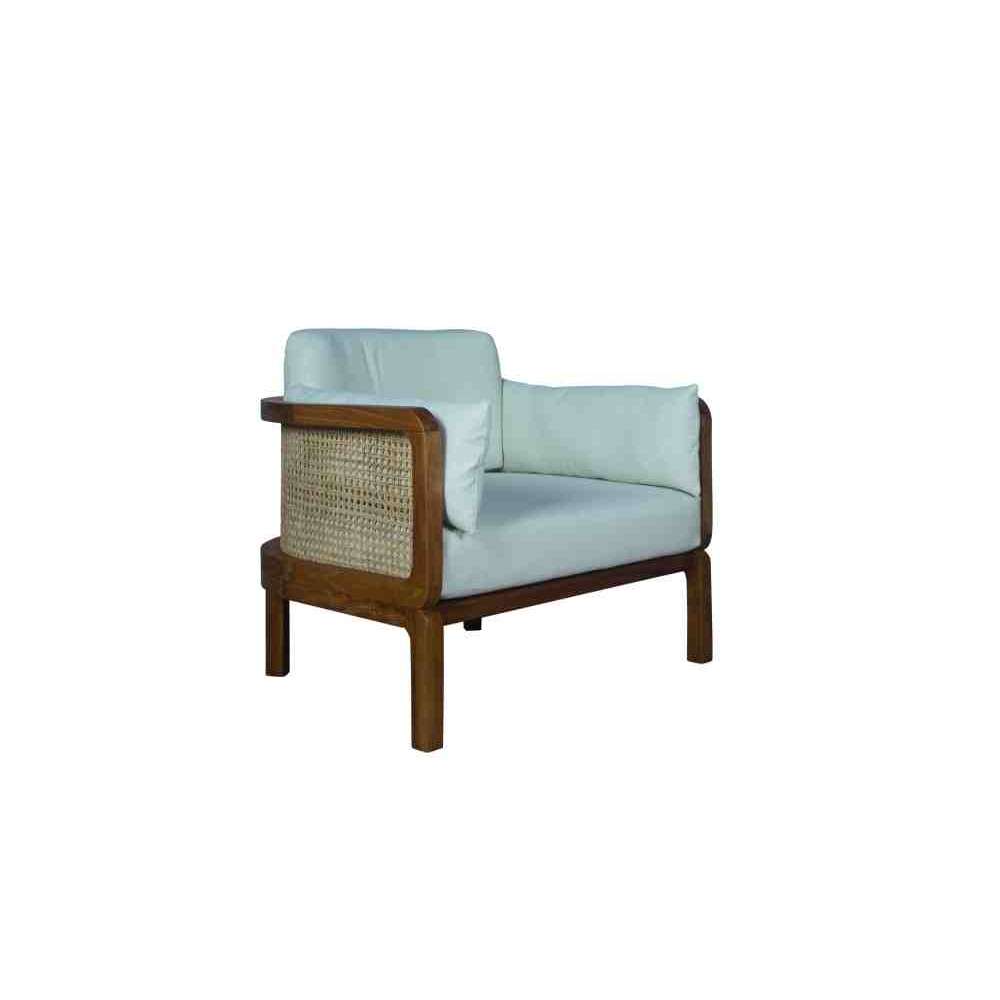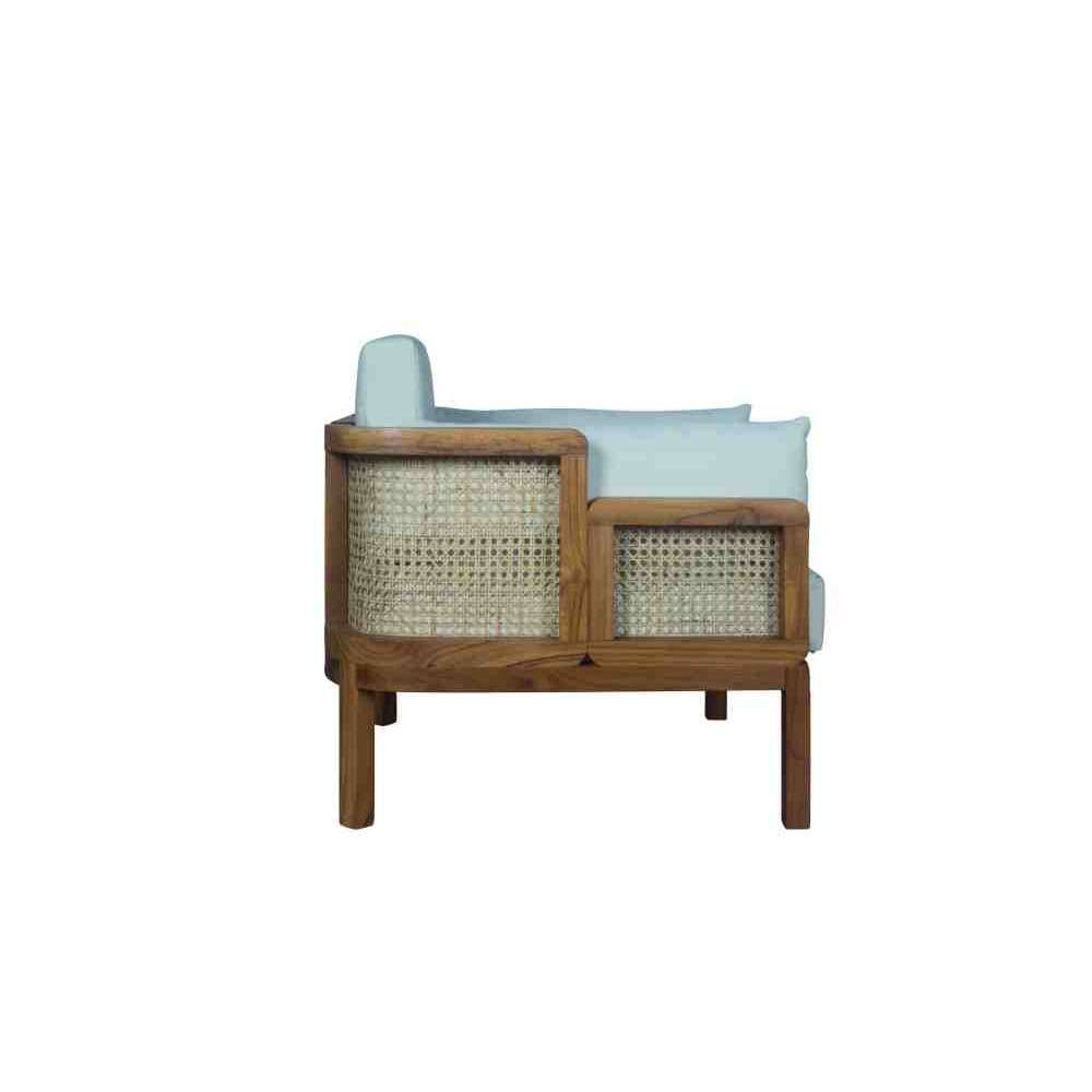 Fotel do jadalni z drewna tekowego i plecionej słomy wiedeńskiej z naturalnego rattanu. Tylne siedzenie jest okrągłe i otula siedzącego, obejmując obszernymi i wygodnymi poduszkami.