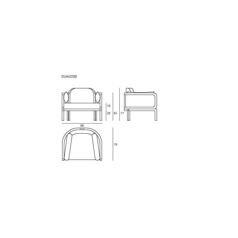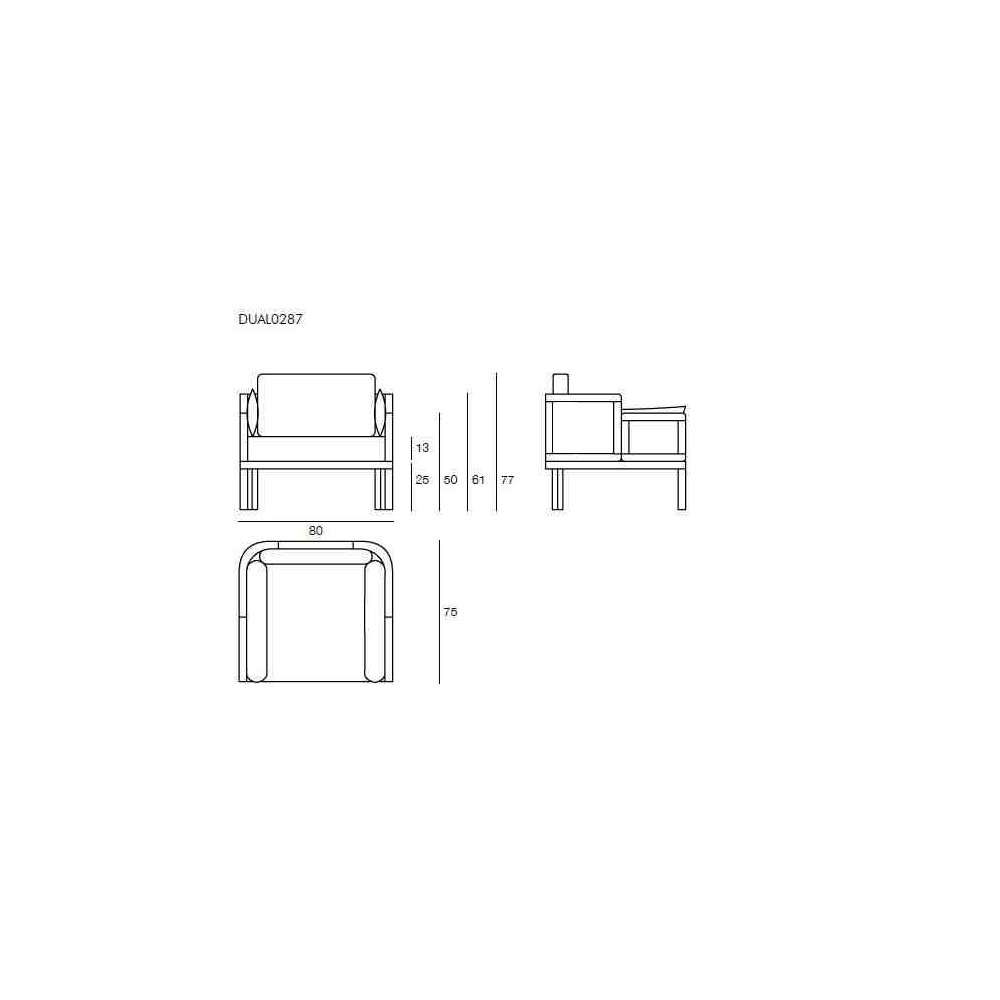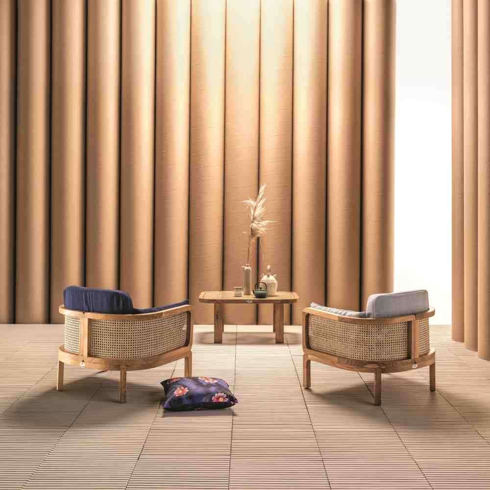 Fotel wykonany z drewna tekowego i plecionej słomy wiedeńskiej z naturalnego włókna. Główną cechą linii Dual jest właśnie dwoistość: kontrast między naturalnym rattanem a drewnem, a także między miękkimi poduszkami a mocną i solidną konstrukcją.