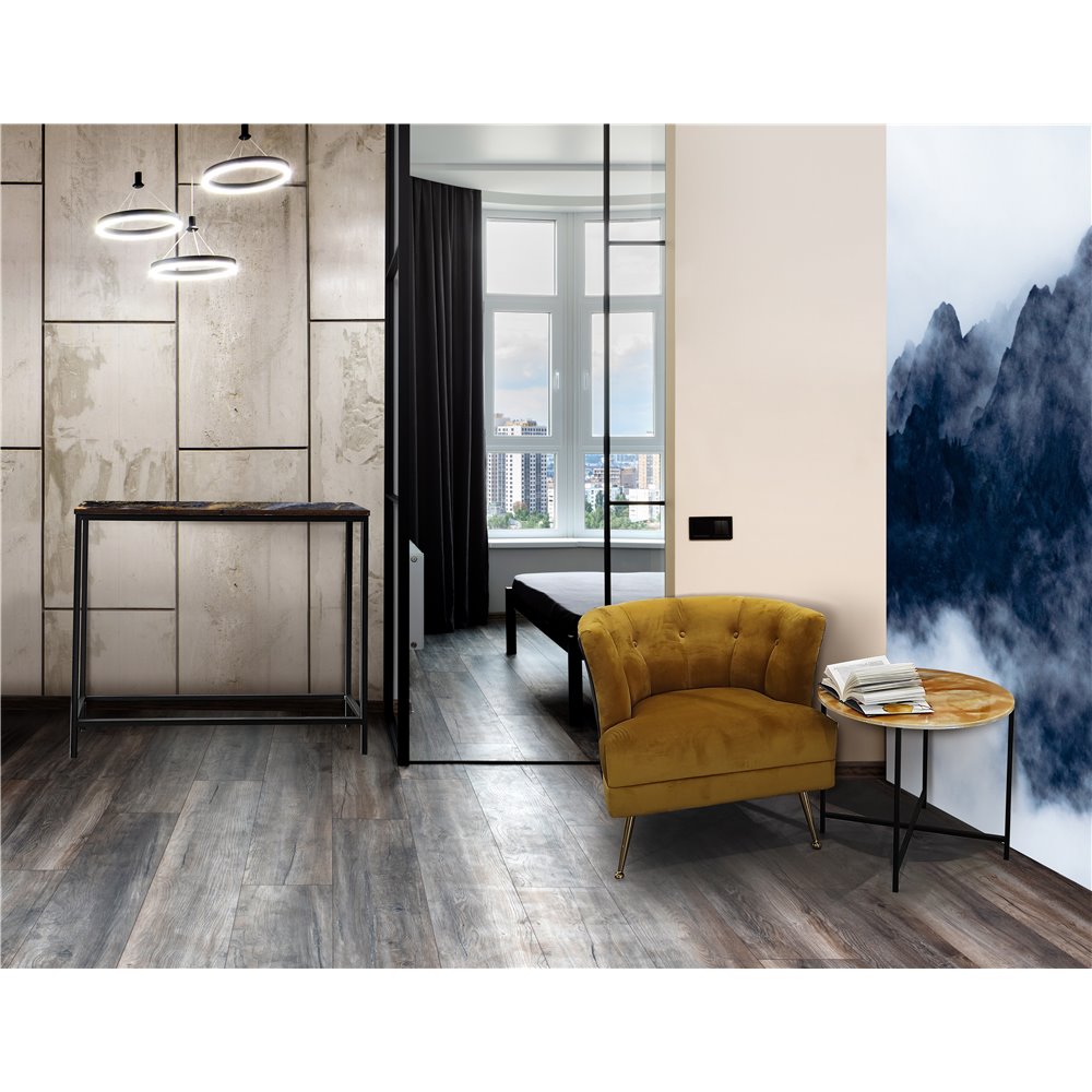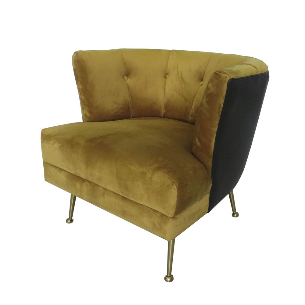 Florence szykowny fotel tapicerowany w musztardowym welurze na złotych nóżkach 71/76/81 cm