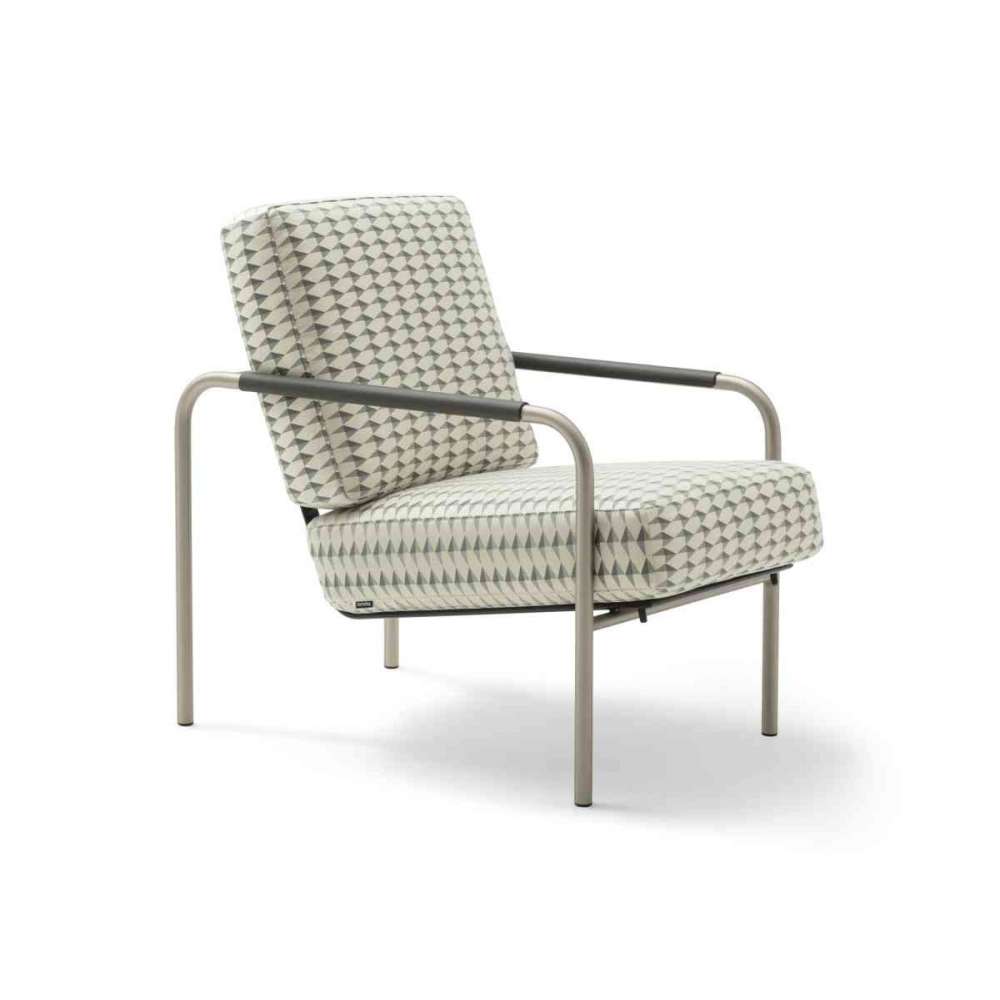 Fotel. Rama nośna z chromowanej lub z naturalnego lub czarnego niklowo-satynowego wykończenia lub z rur stalowych malowanych na czarno. Regulowane dwupozycyjne podparcie poduszki ze stali malowanej na czarno. Tapicerka poduszek z poliuretanu/włókna poliestrowego termozgrzewalnego. Stały wewnętrzny bawełniany pokrowiec. Zdejmowane poduszki zewnętrzne pokryte tkaniną lub skórą. Model z poduszkami pokrytymi tkaniną posiada podłokietniki pokryte skórą 95.
