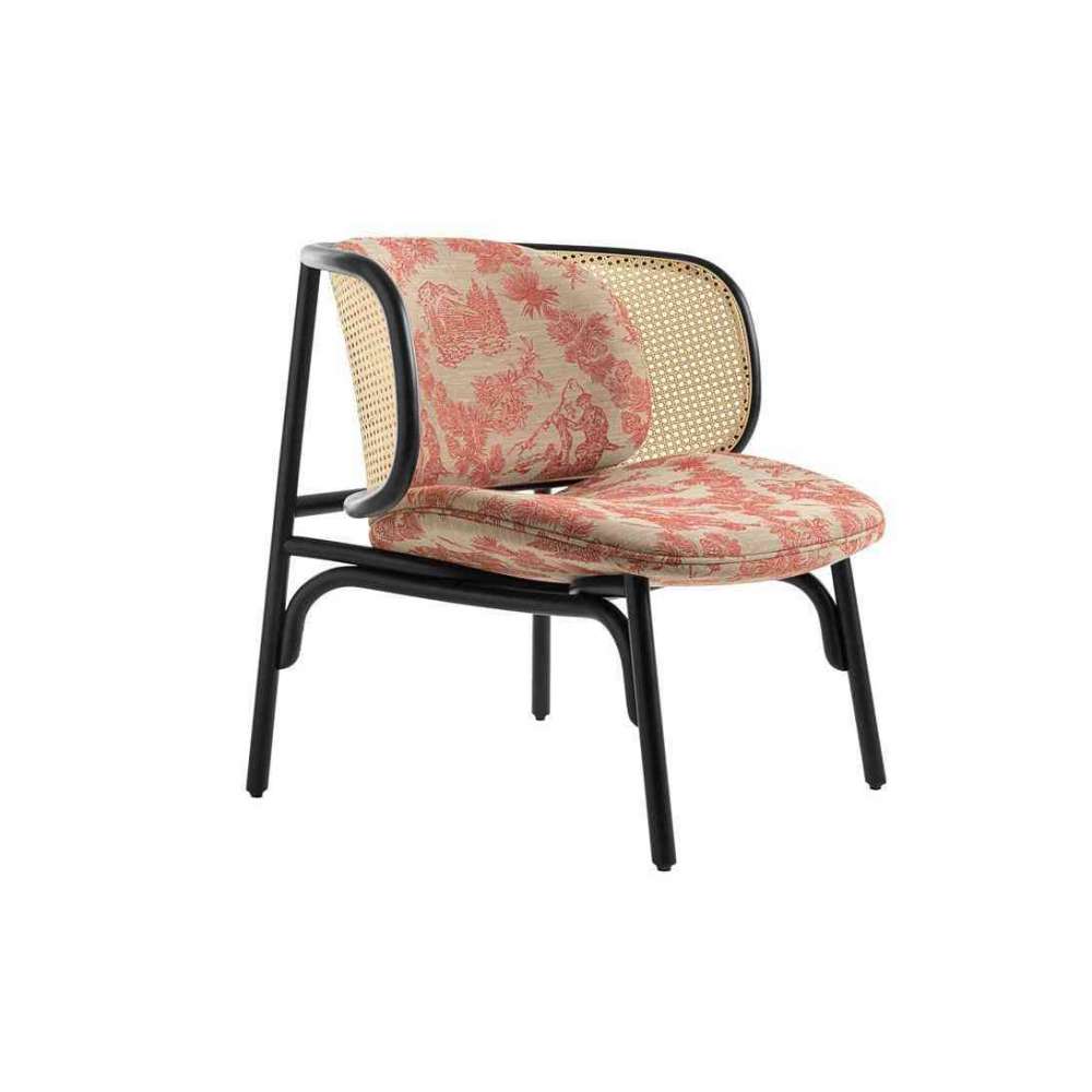 Fotel wypoczynkowy z giętą ramą z drewna bukowego i wstawkami z plecionej trzciny. Tapicerowane siedzisko i oparcie. Tkanina: Stella Alpina 44% VI - 40% PL - 16% LI