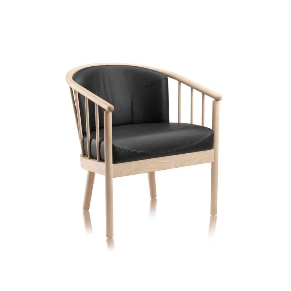 Orion to fotel z tkaniny lub skóry z widoczną drewnianą ramą.