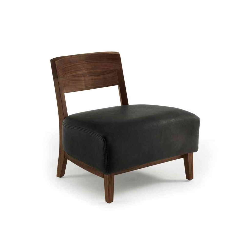 Fotel o konstrukcji z litego drewna. Oparcie z naturalną krawędzią i wygodnym wyściełanym siedziskiem tapicerowanym skórą lub tkaniną z widocznymi przeszyciami. Dostępne z podłokietnikami lub bez.